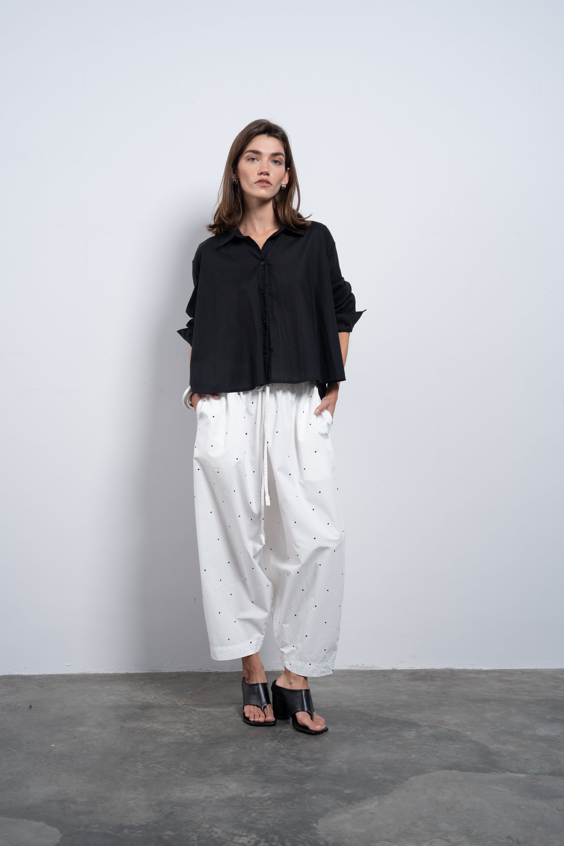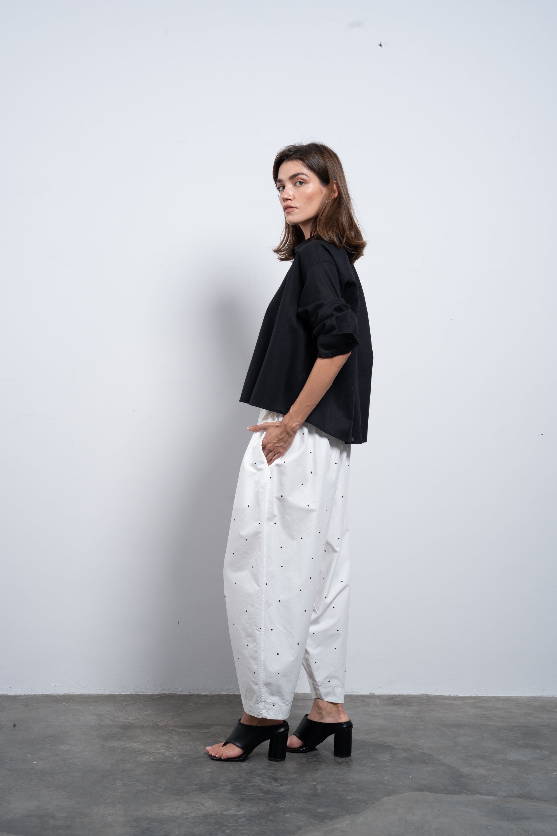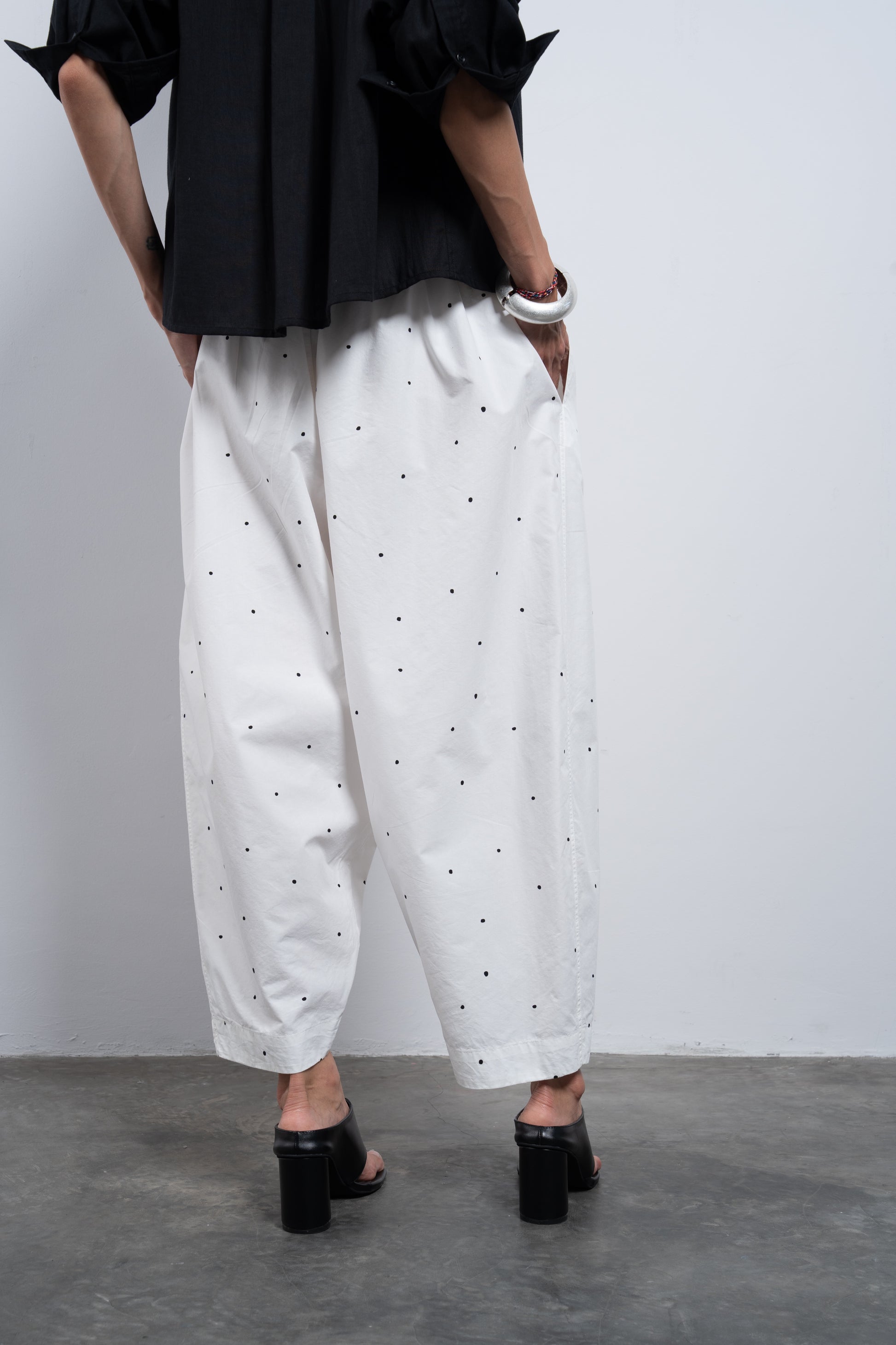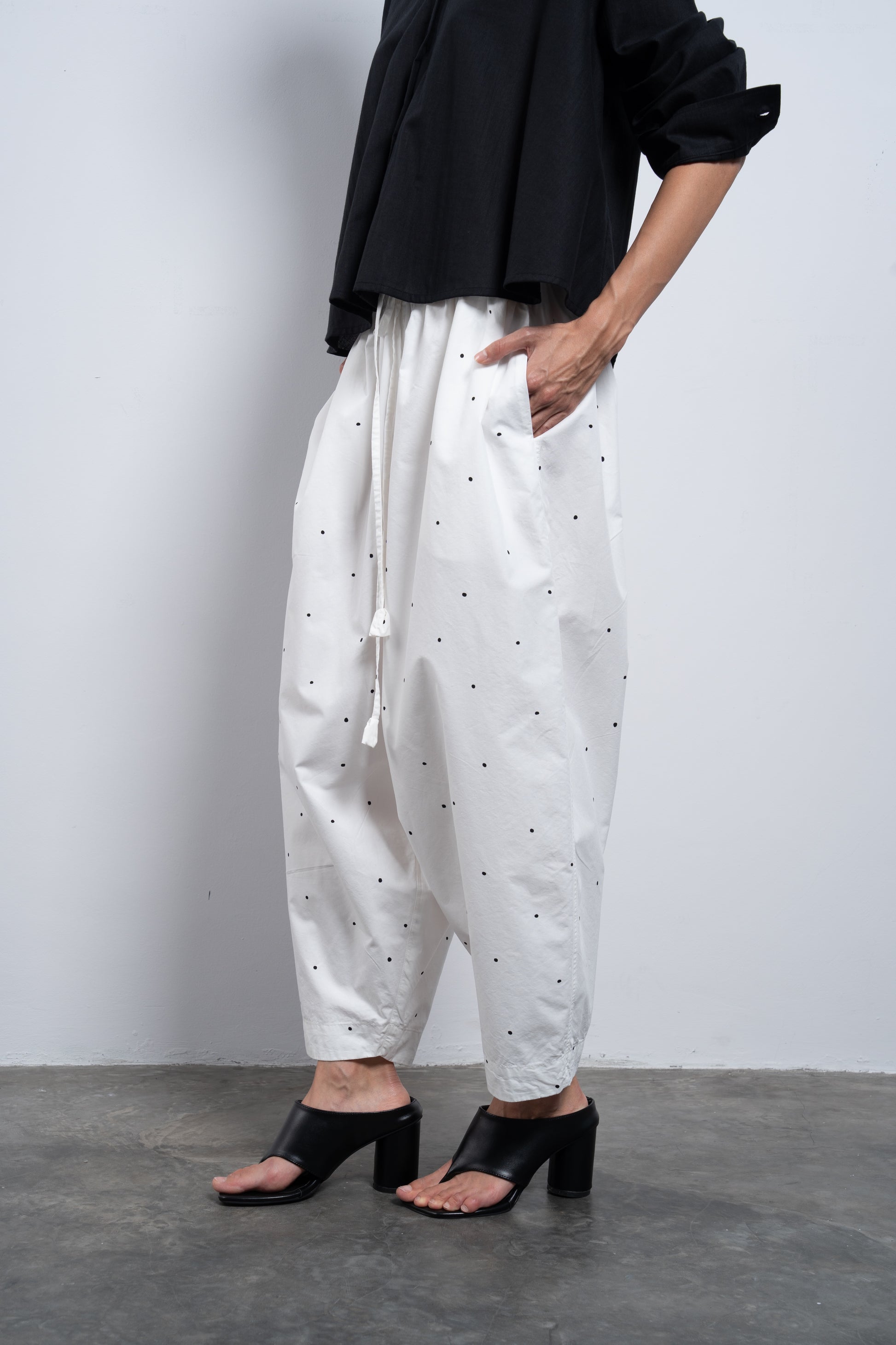 These pants are crafted from airy fabric, designed to sit low on the waist with a sculpted silhouette — generous volume through the leg, gently tapering at the hem for a refined balloon fit.
