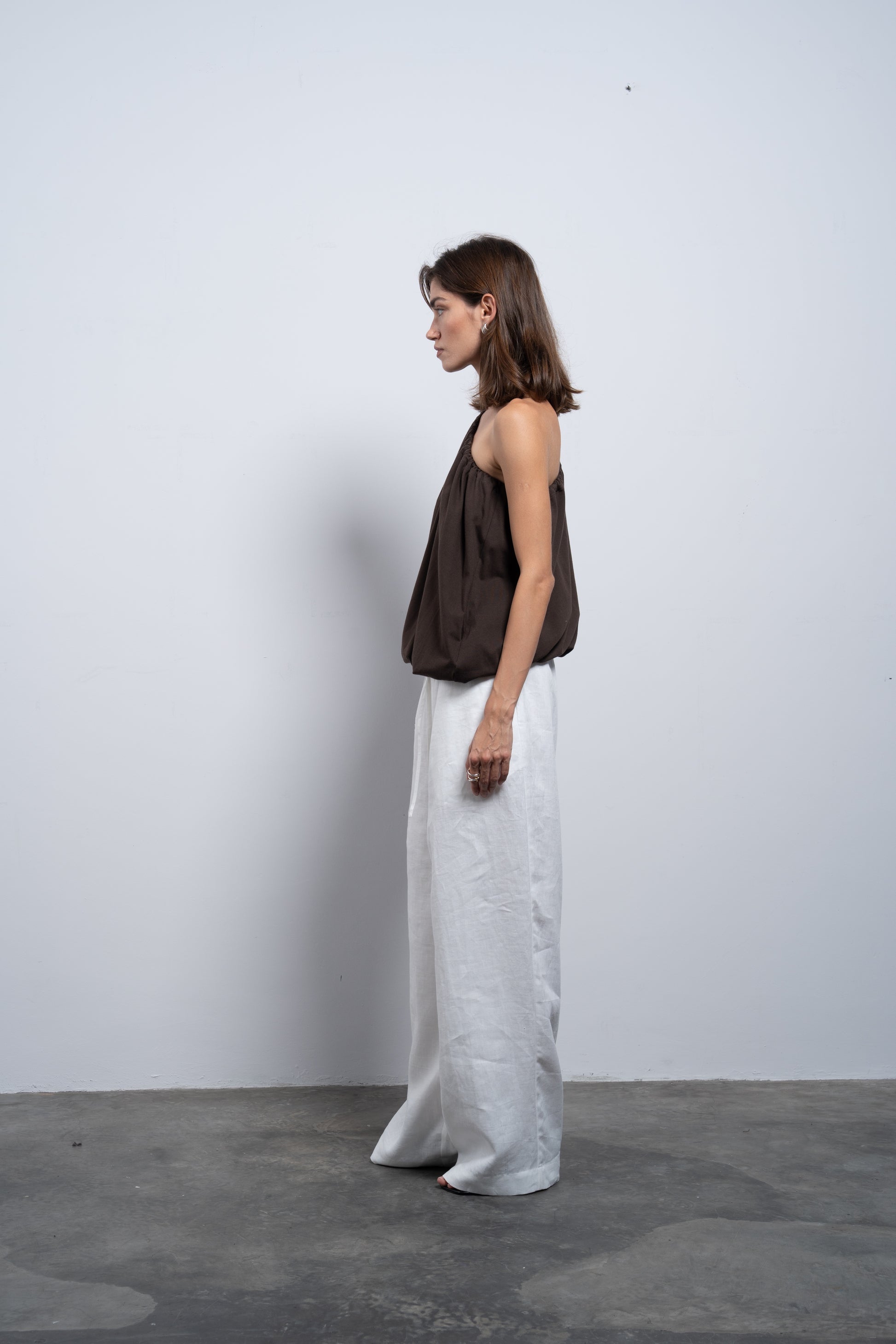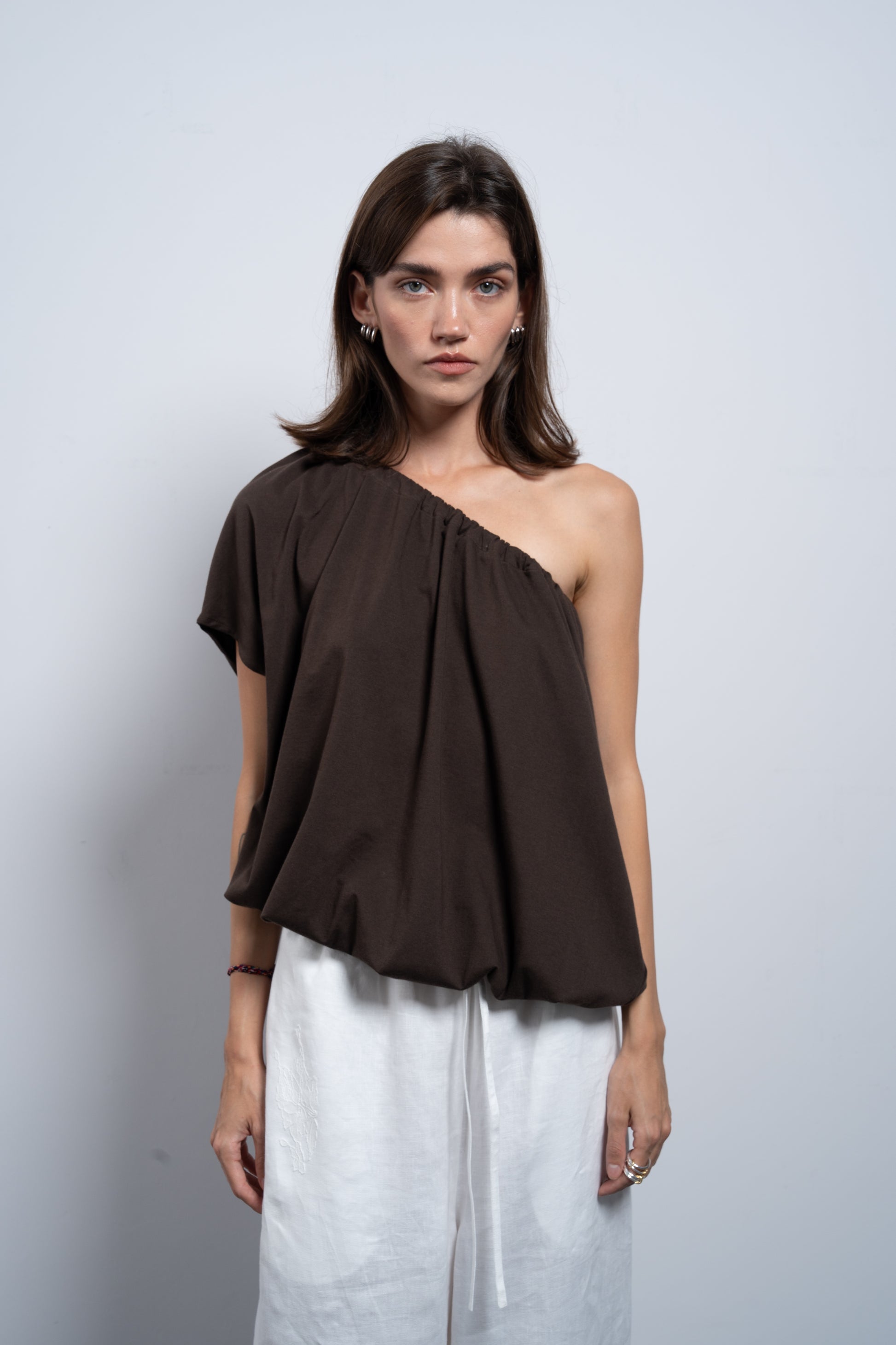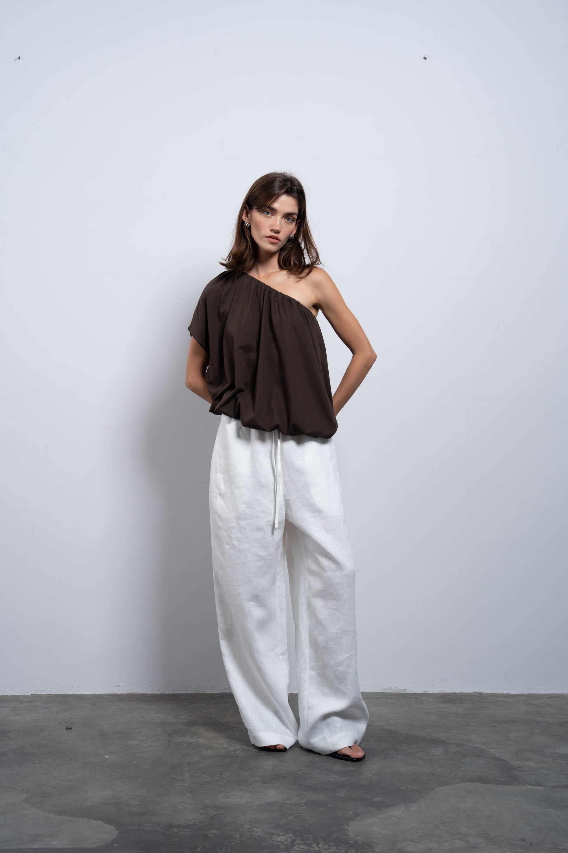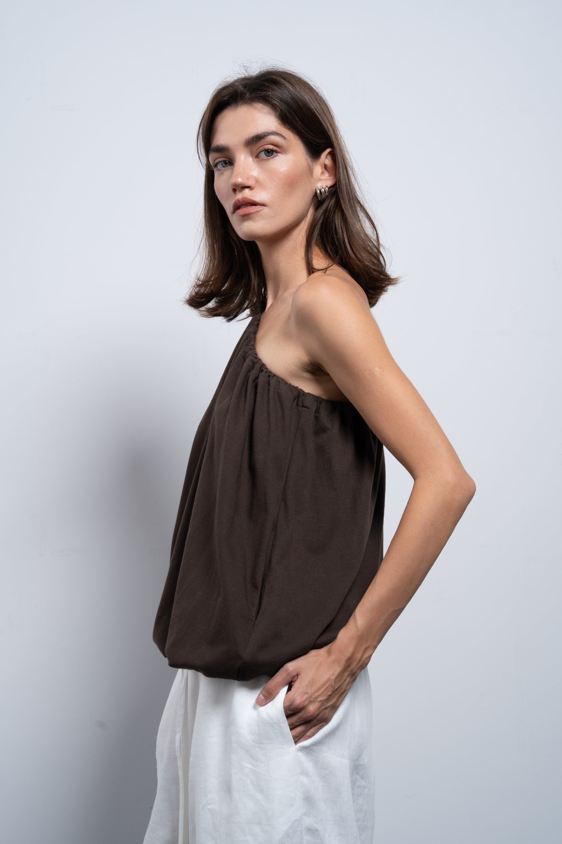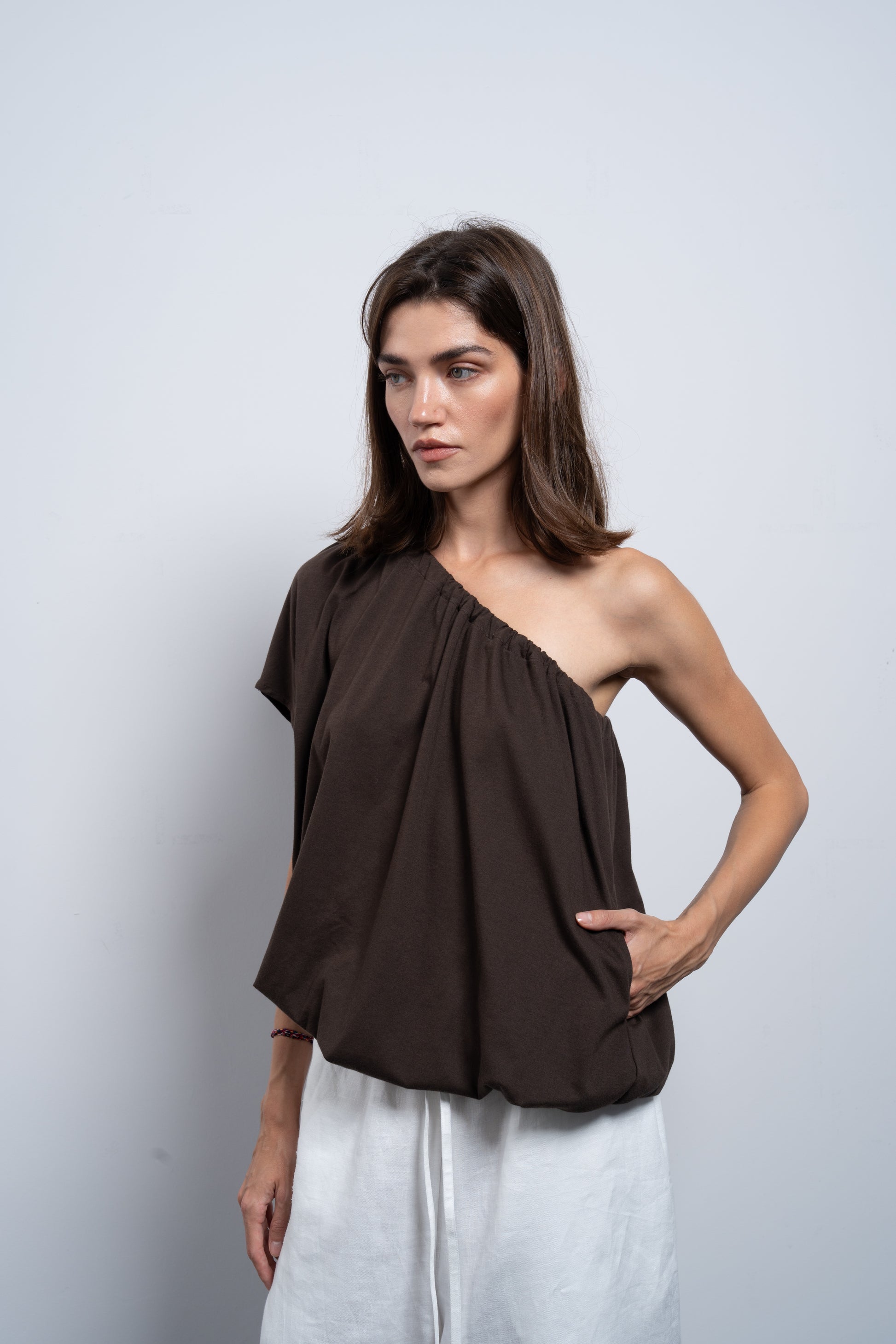 This top balances style and comfort. Cut from pure organic cotton, it has a loose, balloon-fit shape gathered along the one-shoulder neckline with an internal elastic drawcord. Wear it with our linen pants or the Silent Katana leggings from our collection.