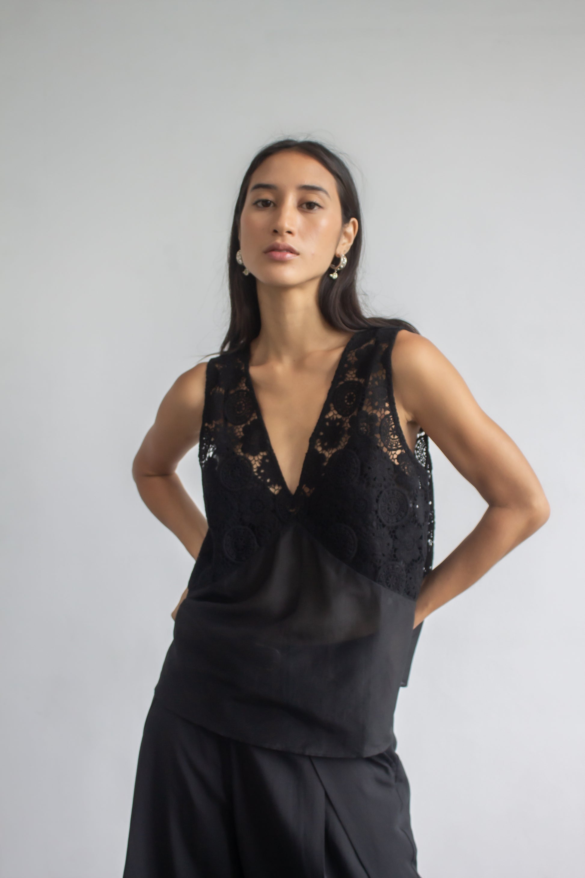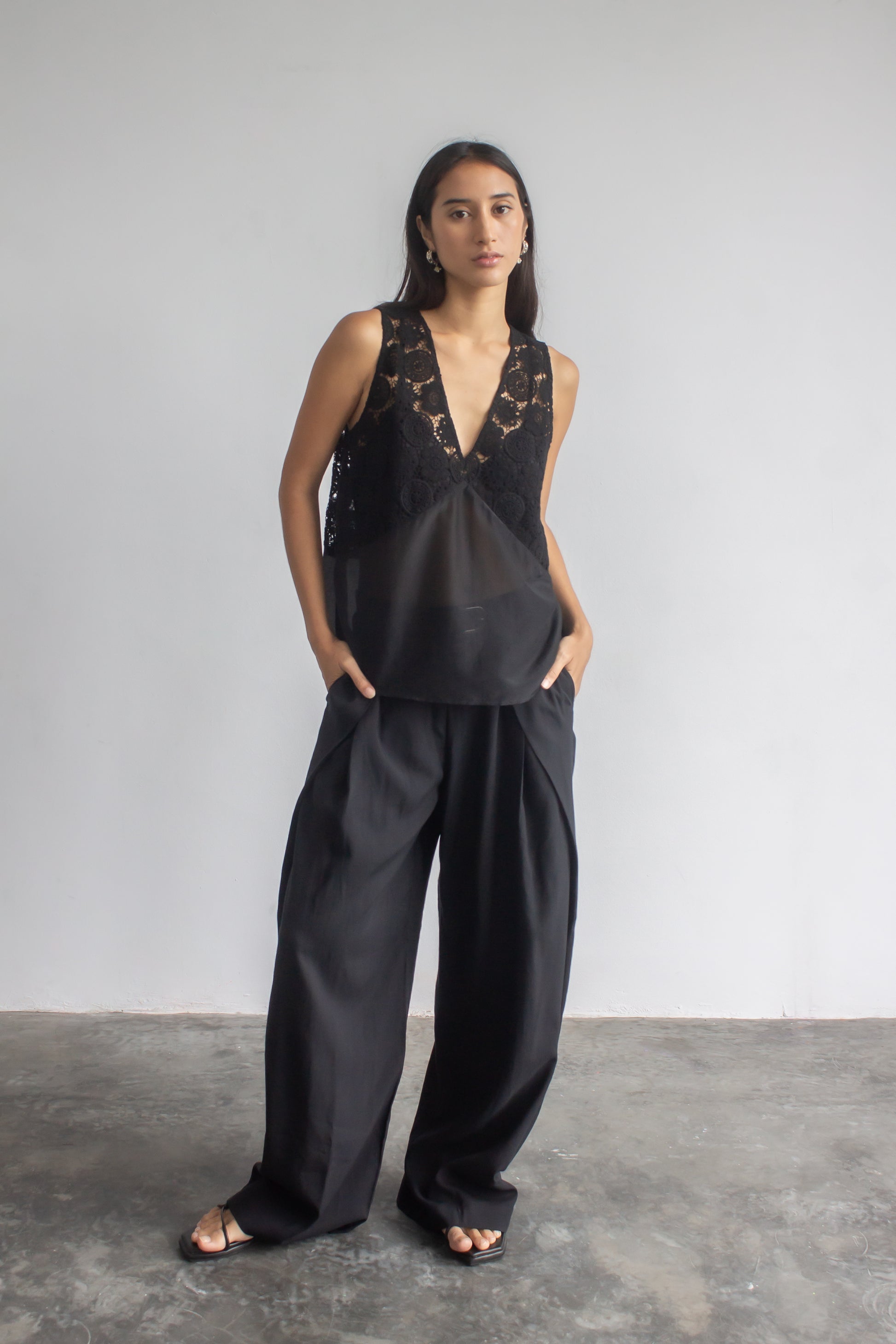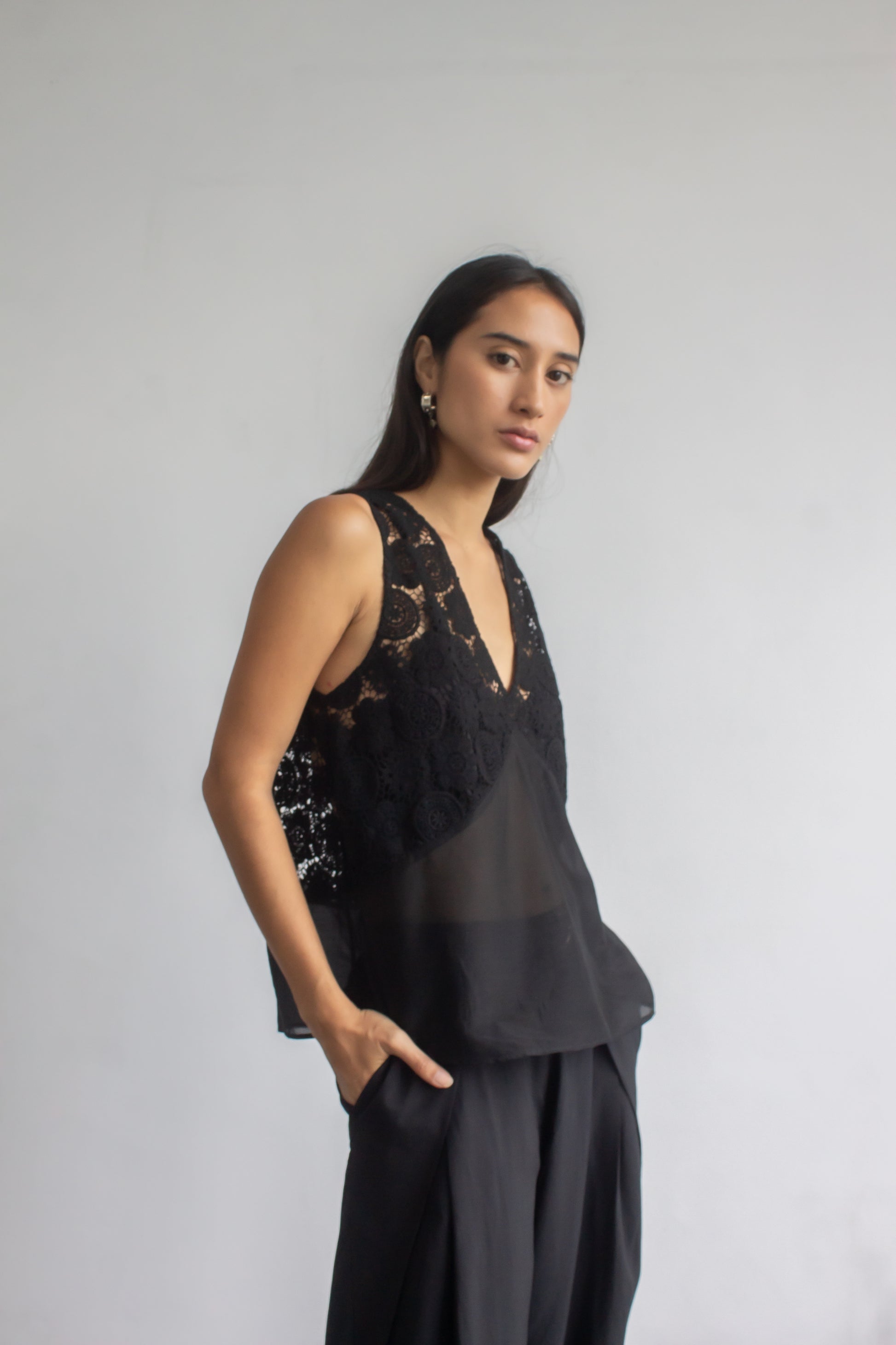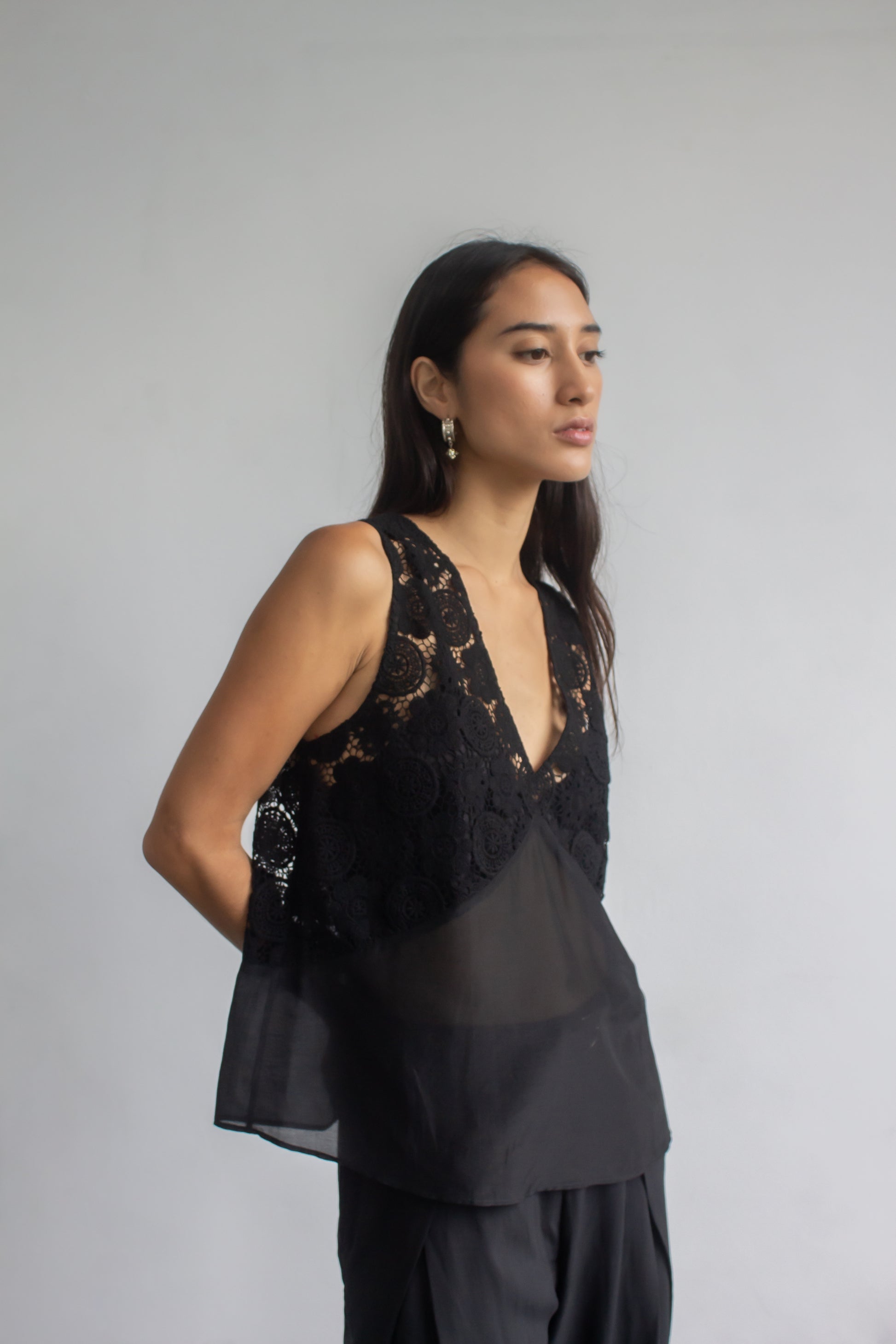 Inspired by vintage references, the Bohemian cropped top is cut from a silk-cotton blend with embroidered cotton panels. It features a deep V-neckline, a sheer back, and an easy A-line silhouette. Style it with leggings and ballet flats, or pair it with wide pleated trousers.