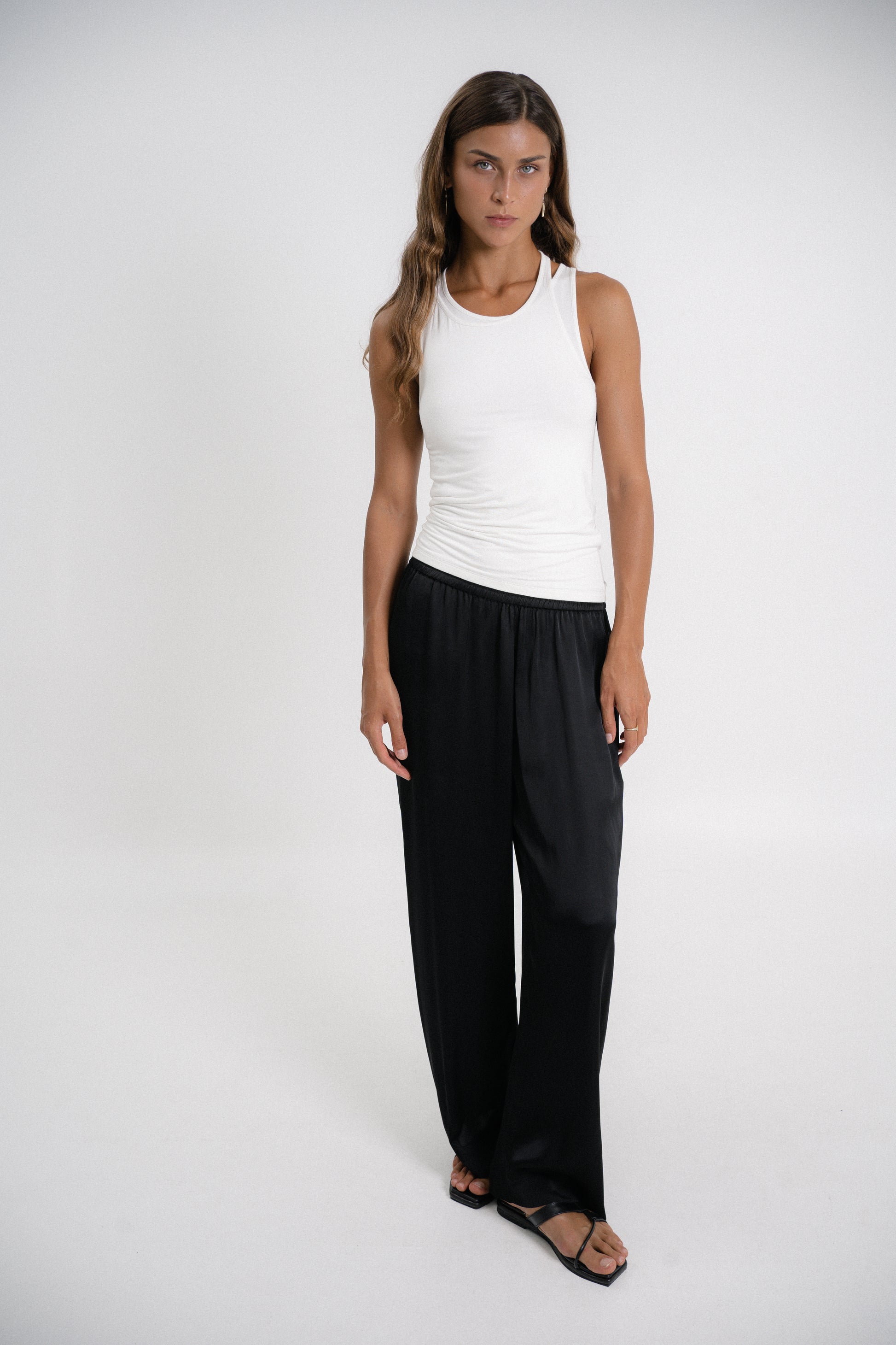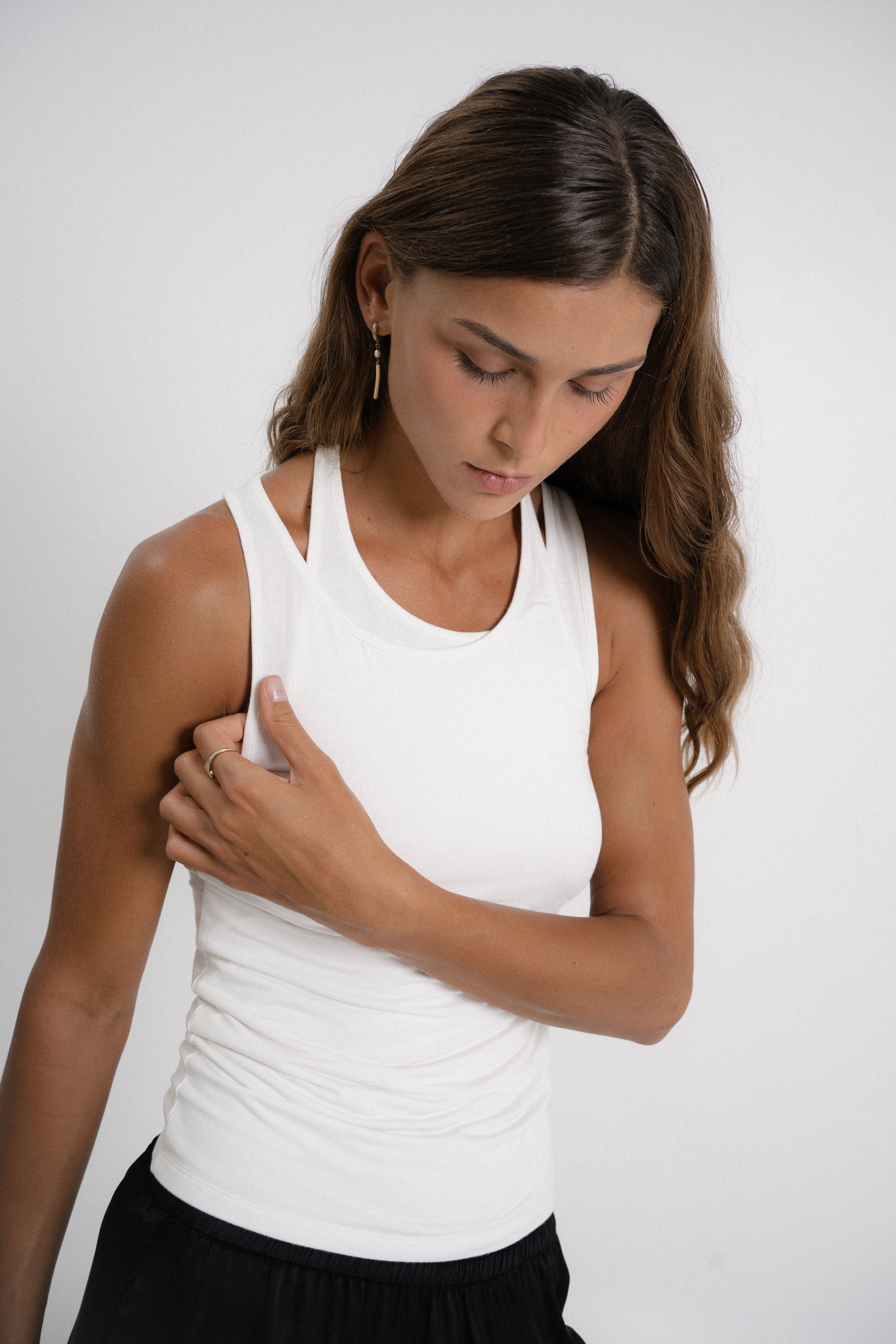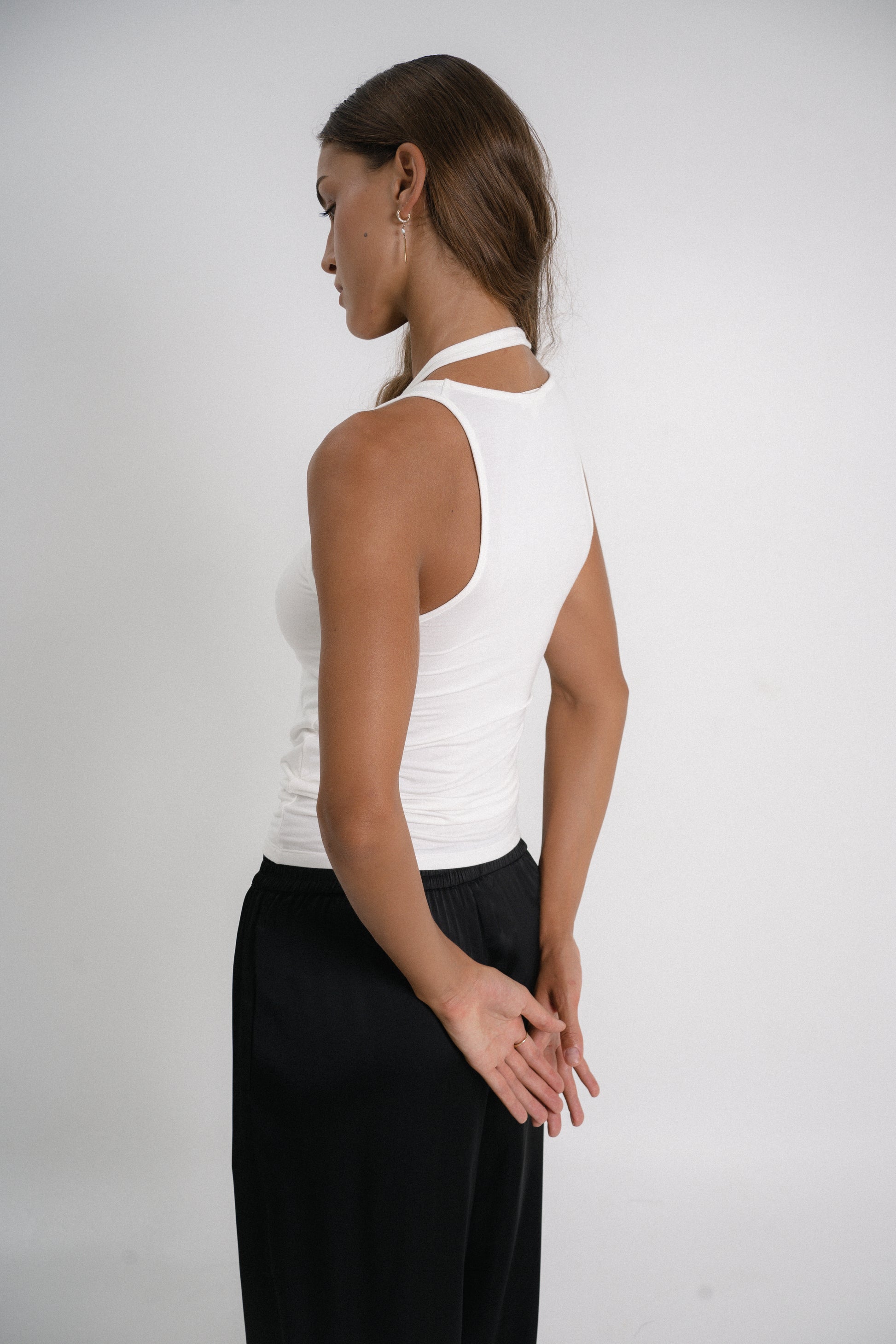 The styling options are endless with our "Not a Must" bamboo tank top—wear it alone with satin pants, our linen tailoring shorts, or your favourite jeans. It's made from ribbed-knit for a close fit and comes in off-white and black.