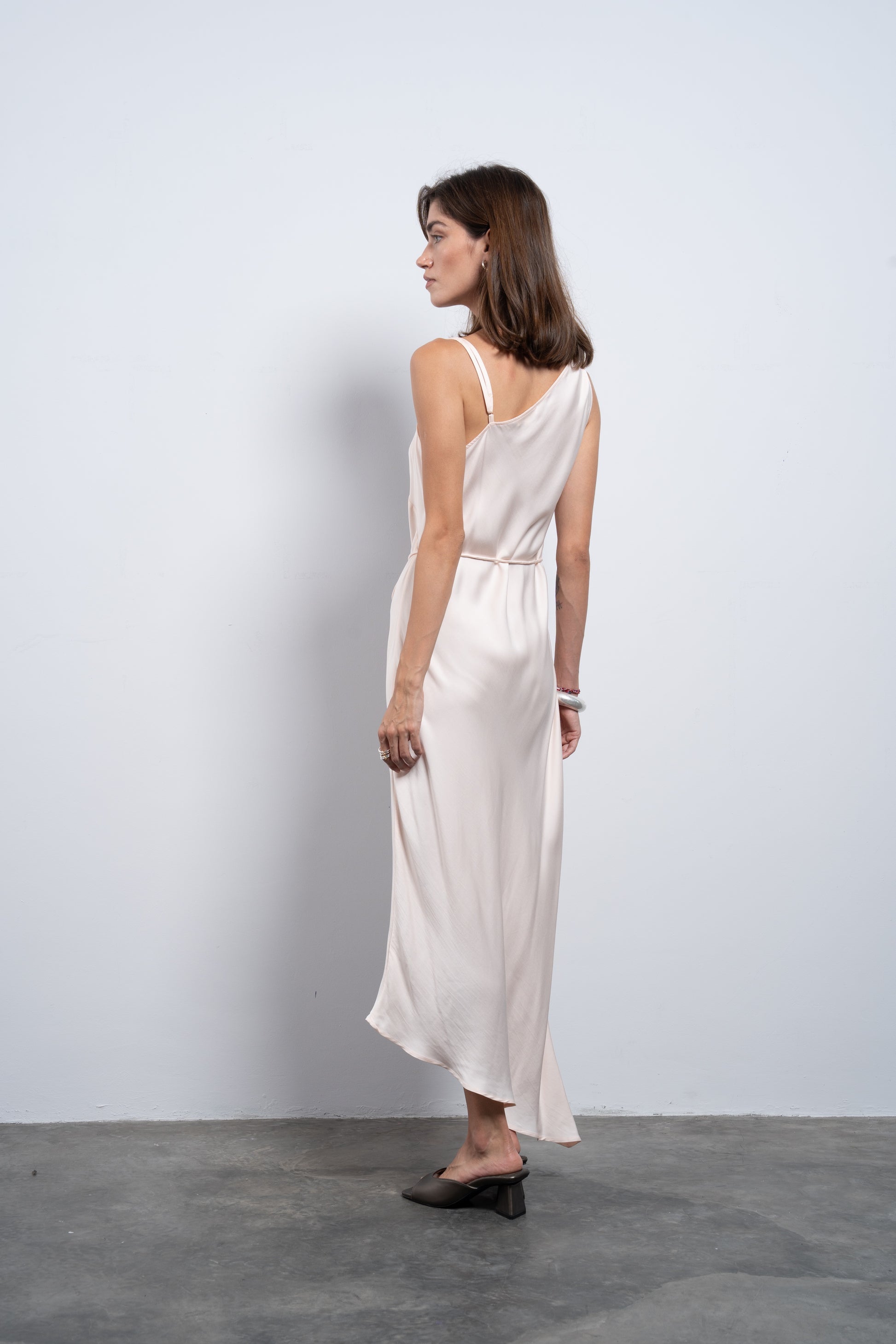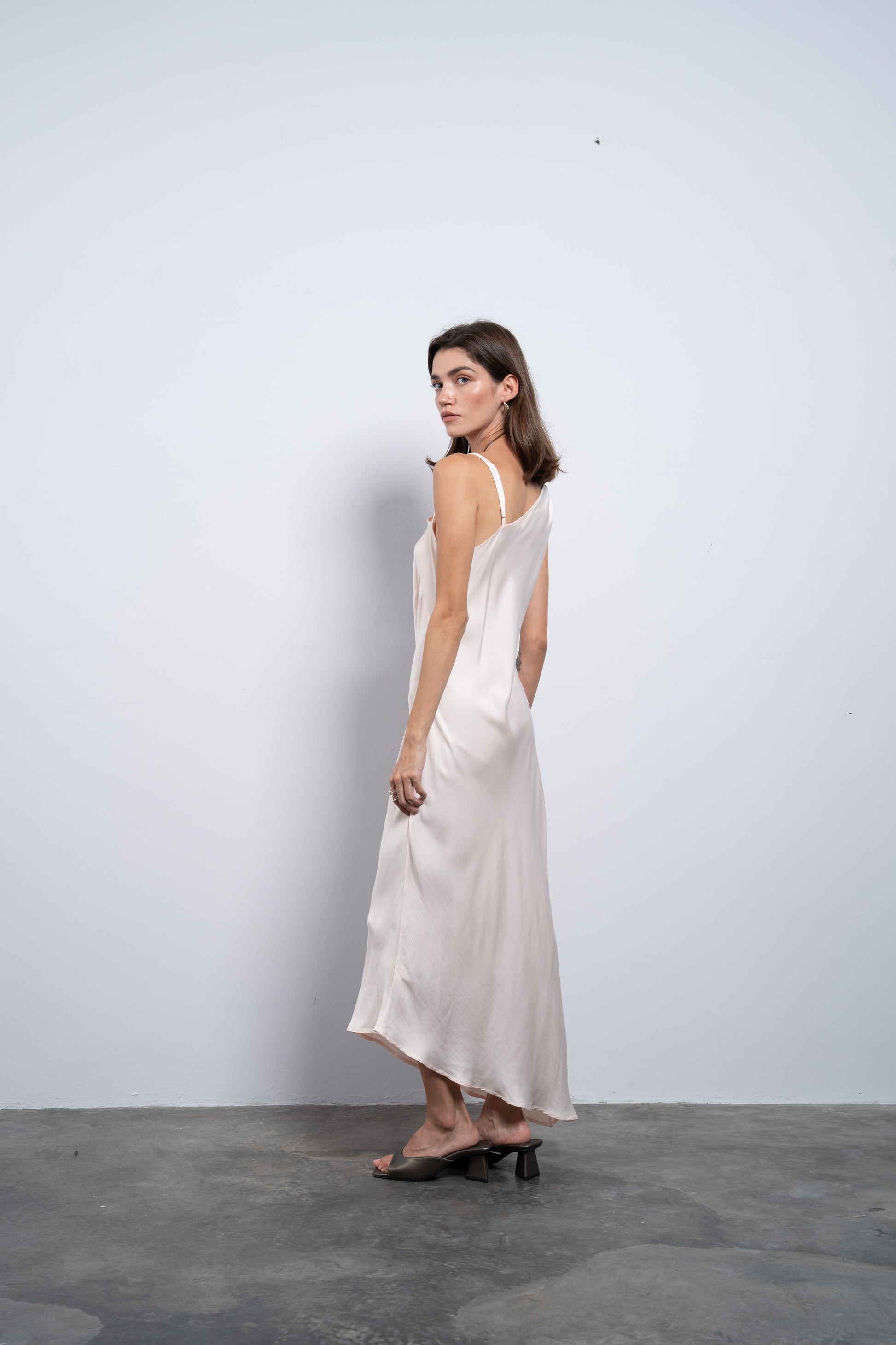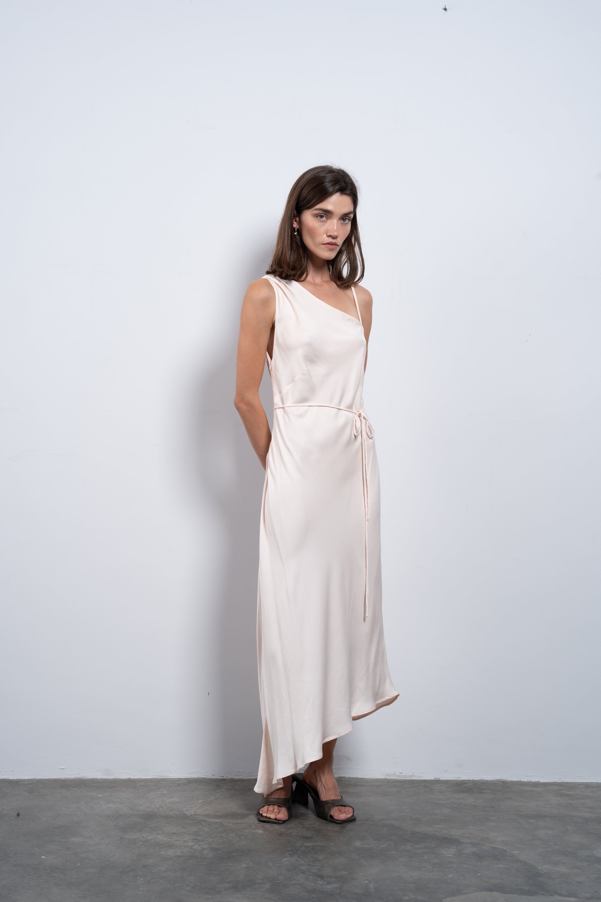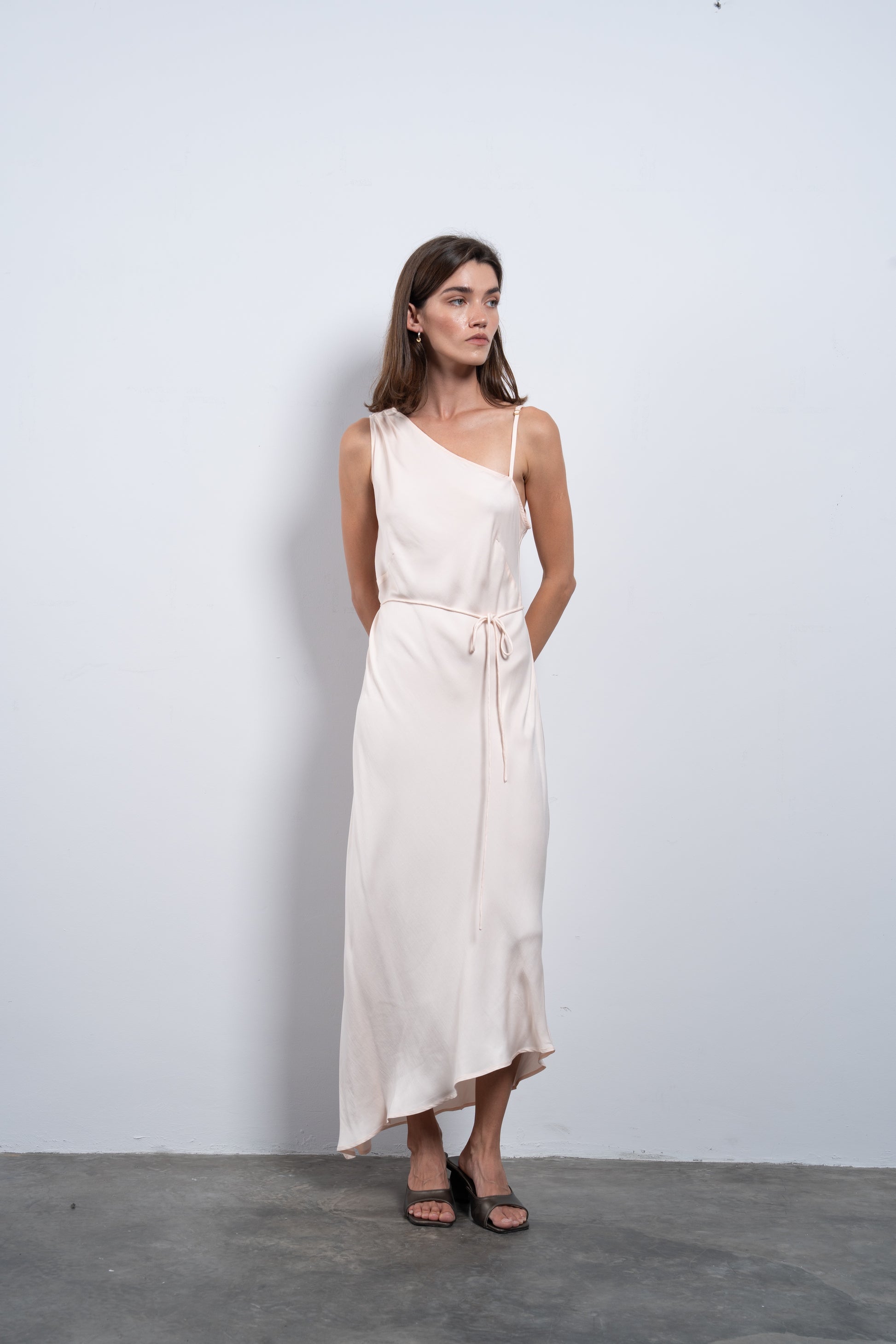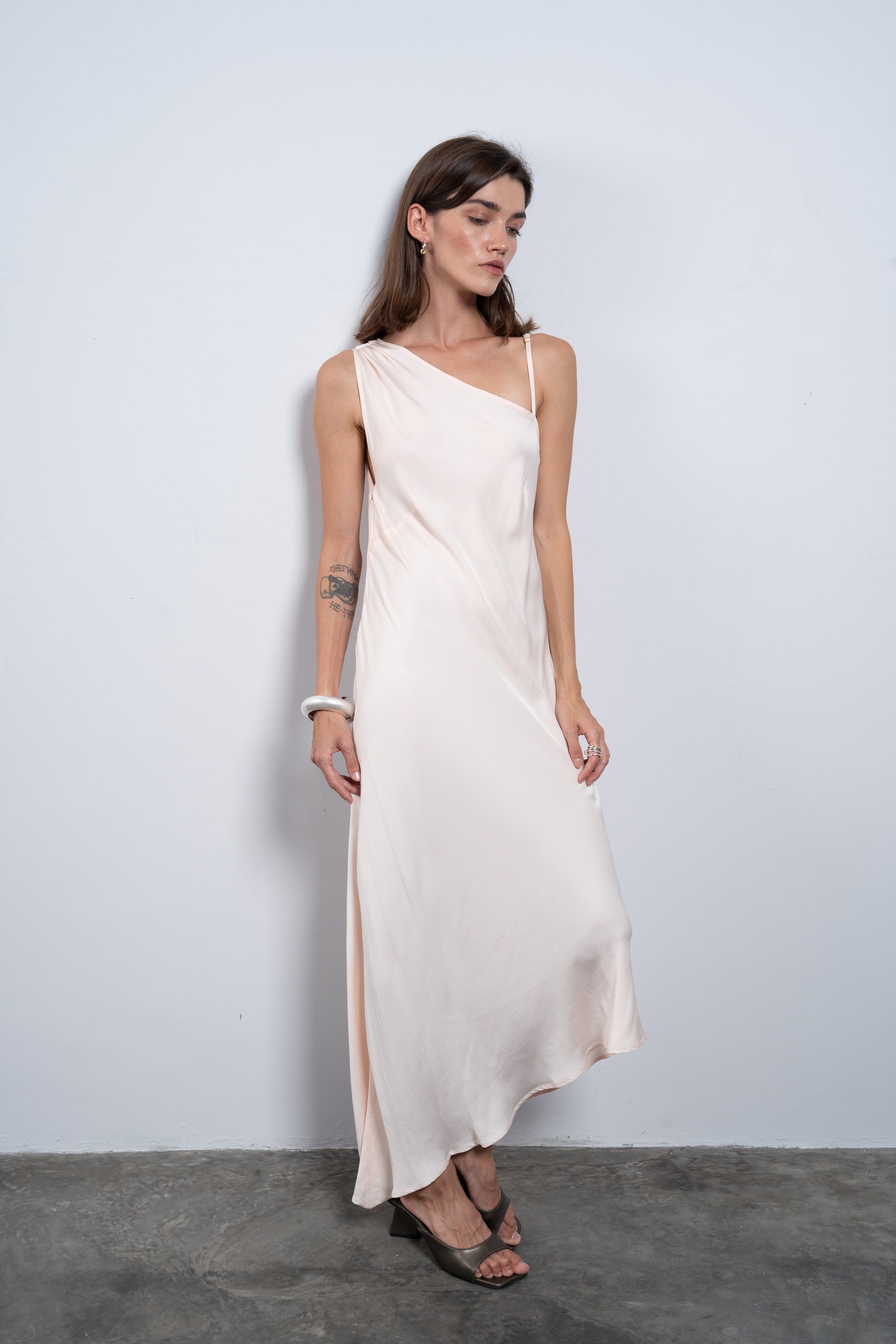 This midi dress is incredibly easy to style, making it perfect for vacations or last-minute parties. It is cut on the bias from natural modal fabric that skims your frame and features an asymmetric hem that mirrors the sweeping one-shoulder neckline. The dress has a gathered detail on the shoulder that adds a chic touch. Layer it over a simple tank top for a more casual look, or wear it as a standalone dress for a night out.