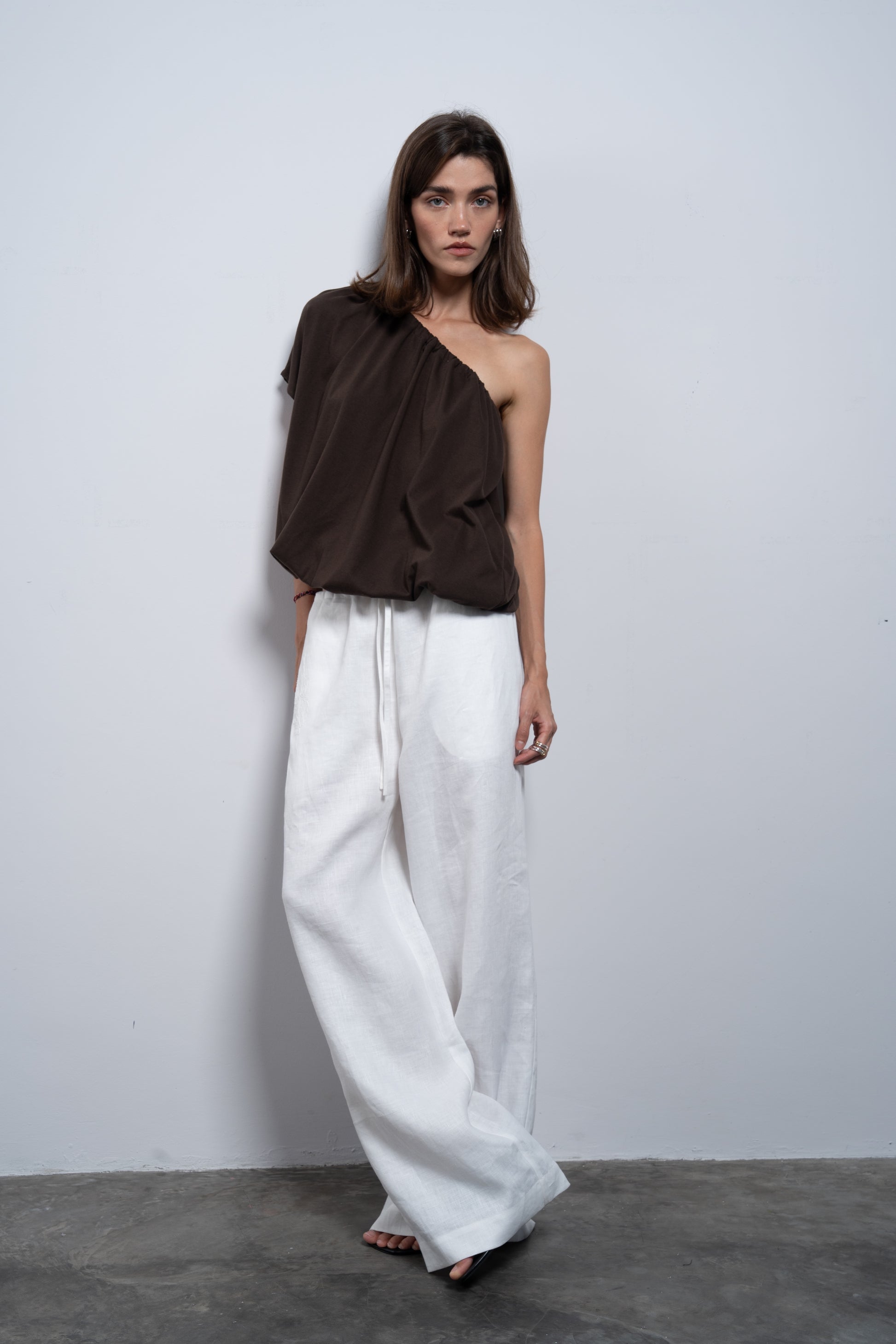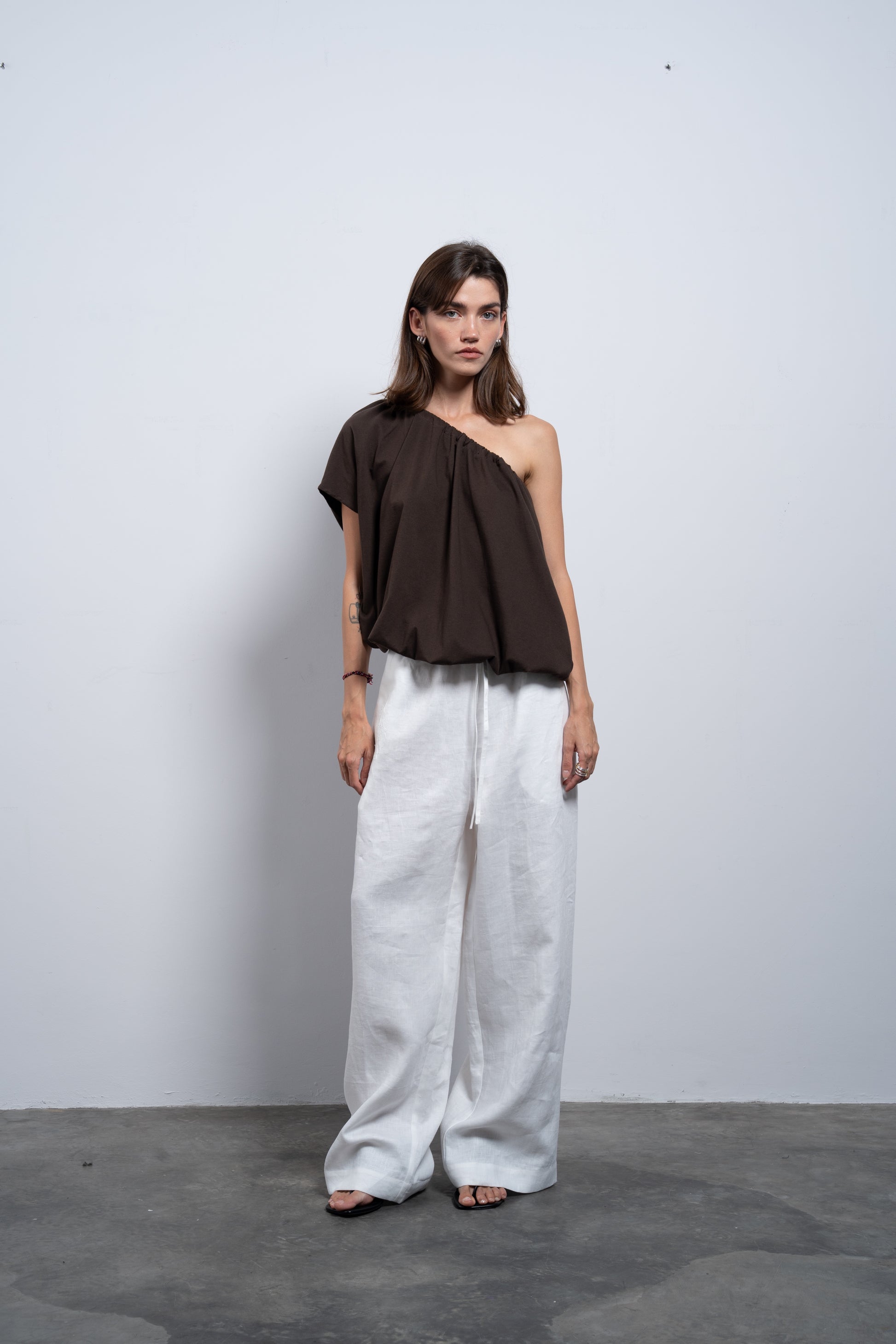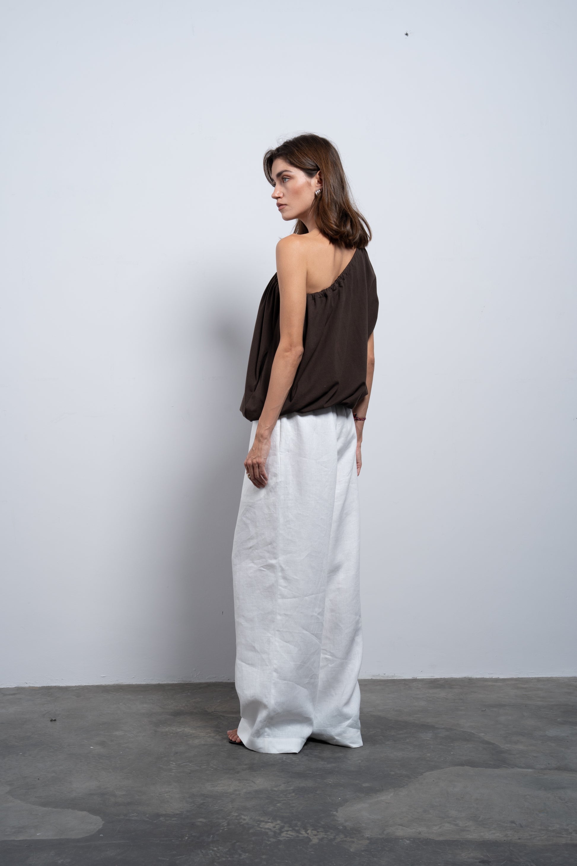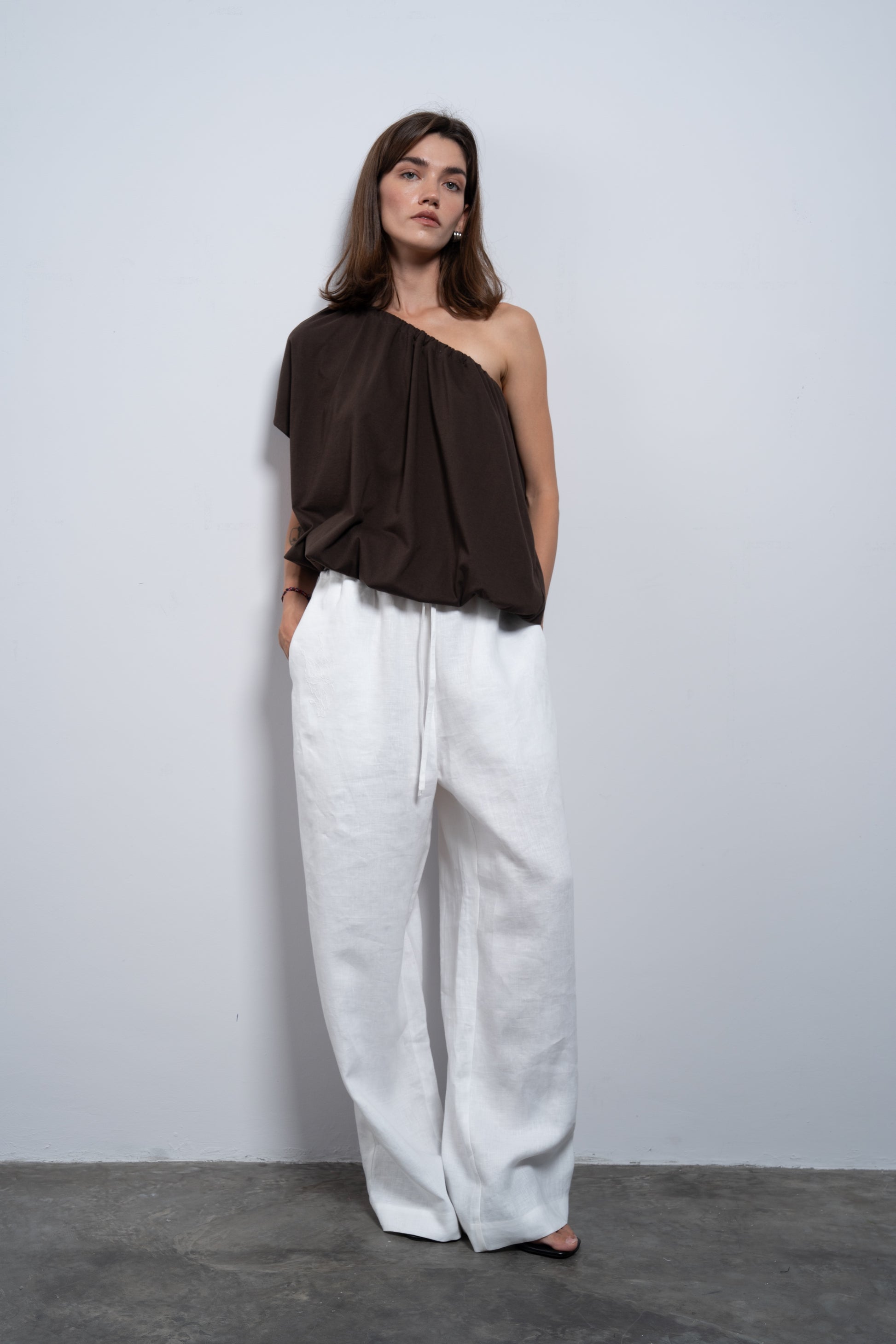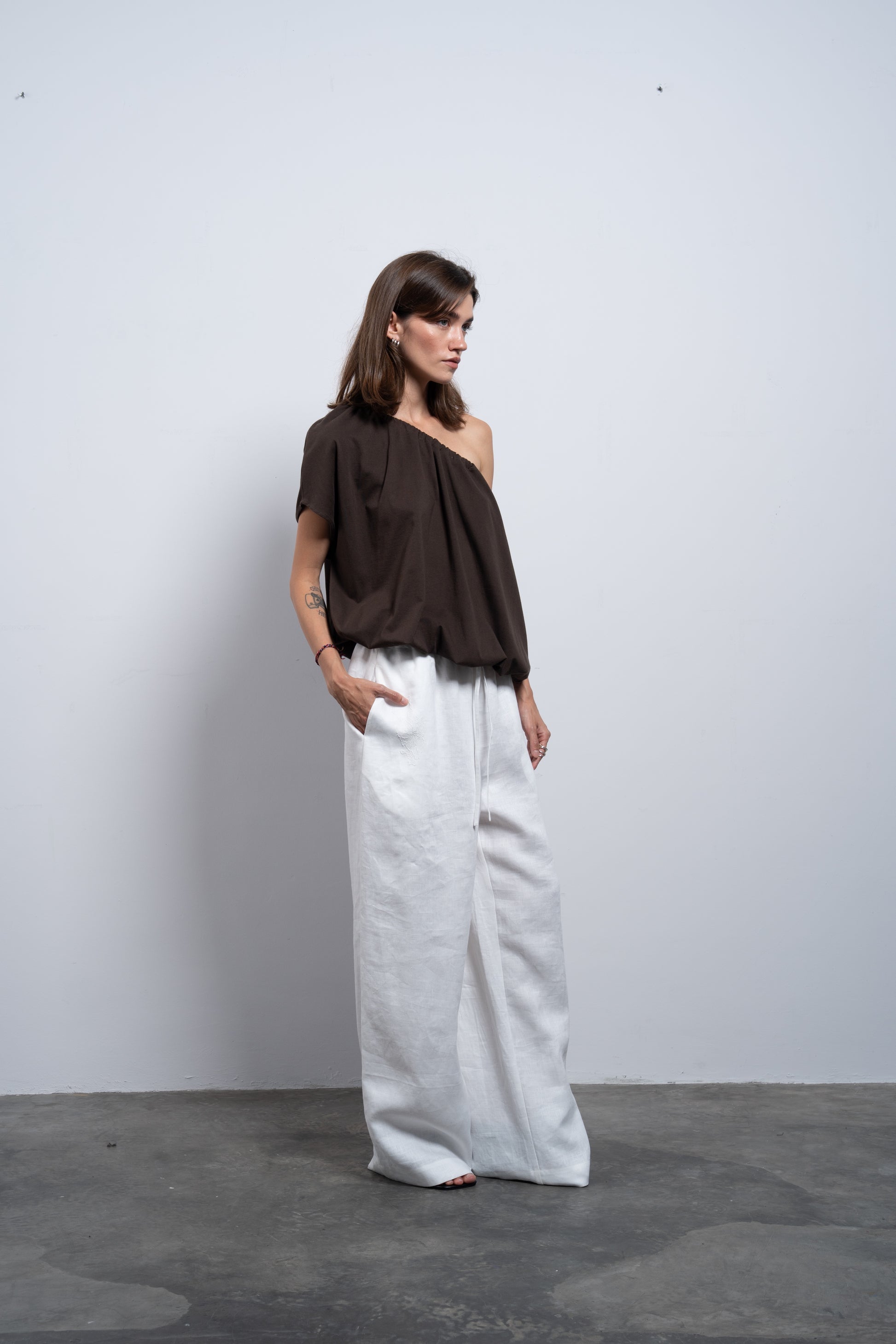 When it comes to selecting fabrics, the key factors are how they drape and feel. These pants are crafted from pure linen with twill structure, which is incredibly soft and lightweight against your skin. They feature an elastic waistband and roomy wide legs. Pair them with a balloon t-shirt or a tank top for a stylish look.
