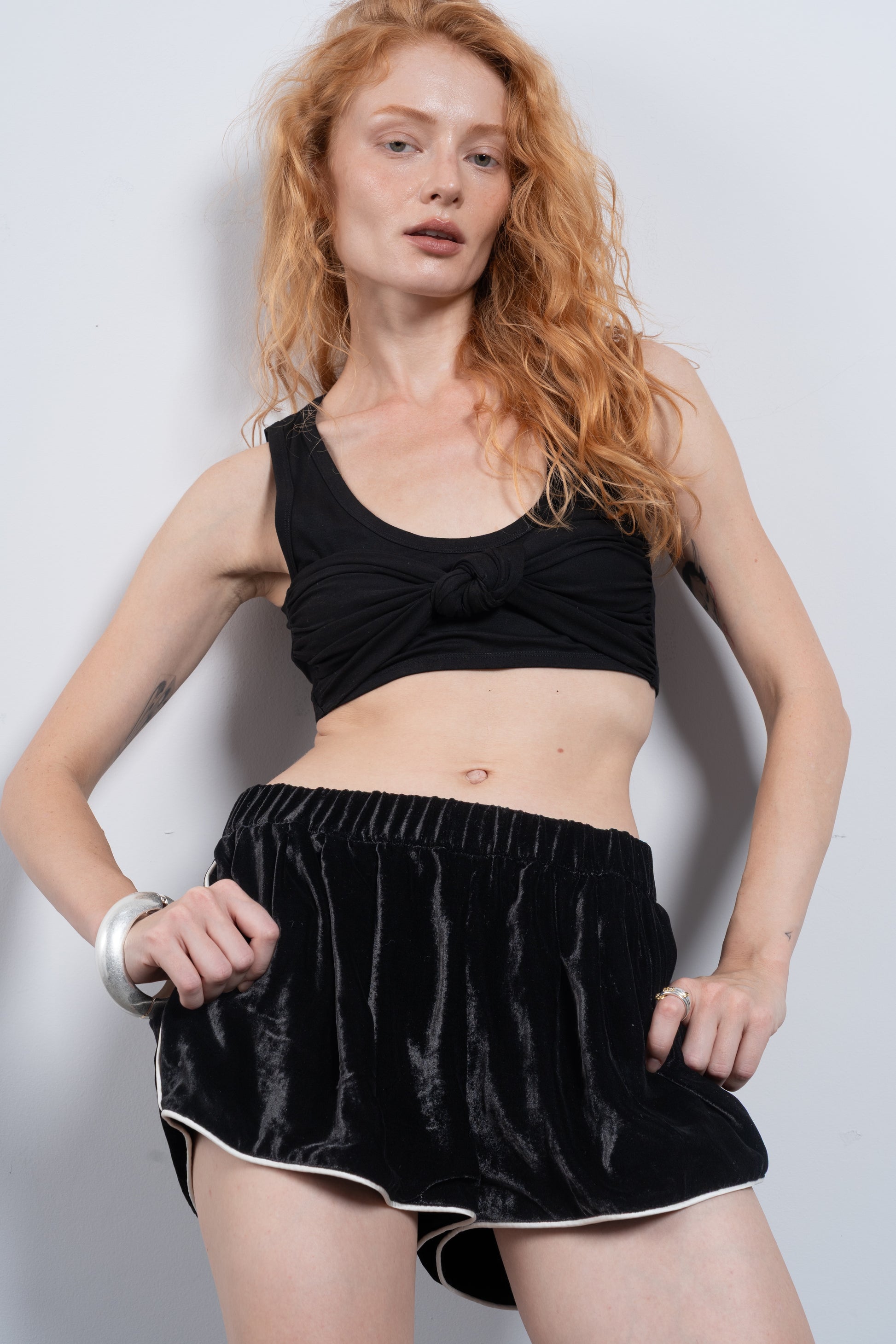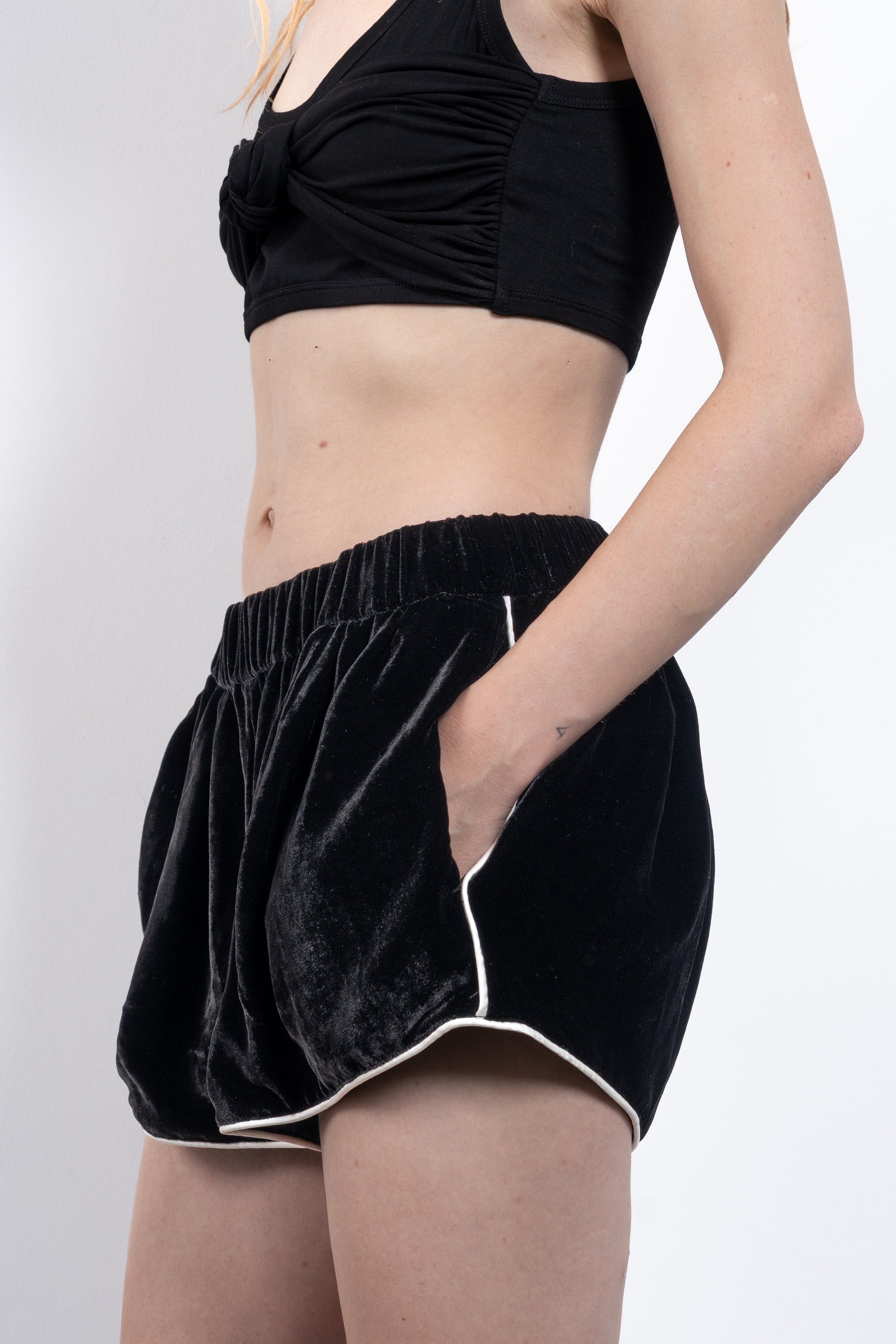 Discover the perfect fusion of sporty and chic with our silk velvet shorts. Crafted from 100% luxurious silk and lined with silky viscose, these shorts bring unparalleled comfort. Inspired by the dynamic fit of Muay Thai, they add a touch of fierce elegance to any look. The contrast piping along the sides enhances the silhouette, making them a standout piece for any wardrobe.