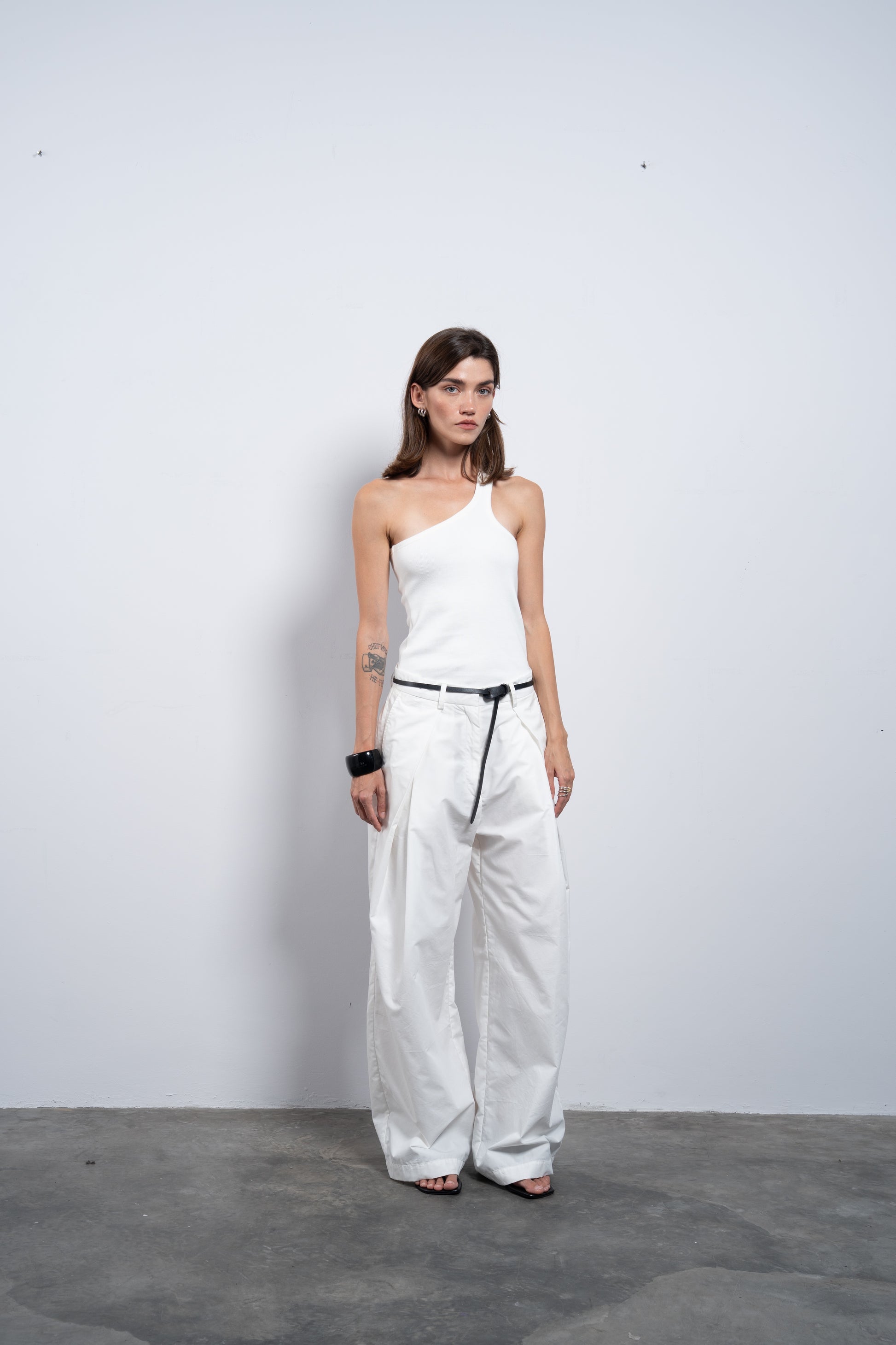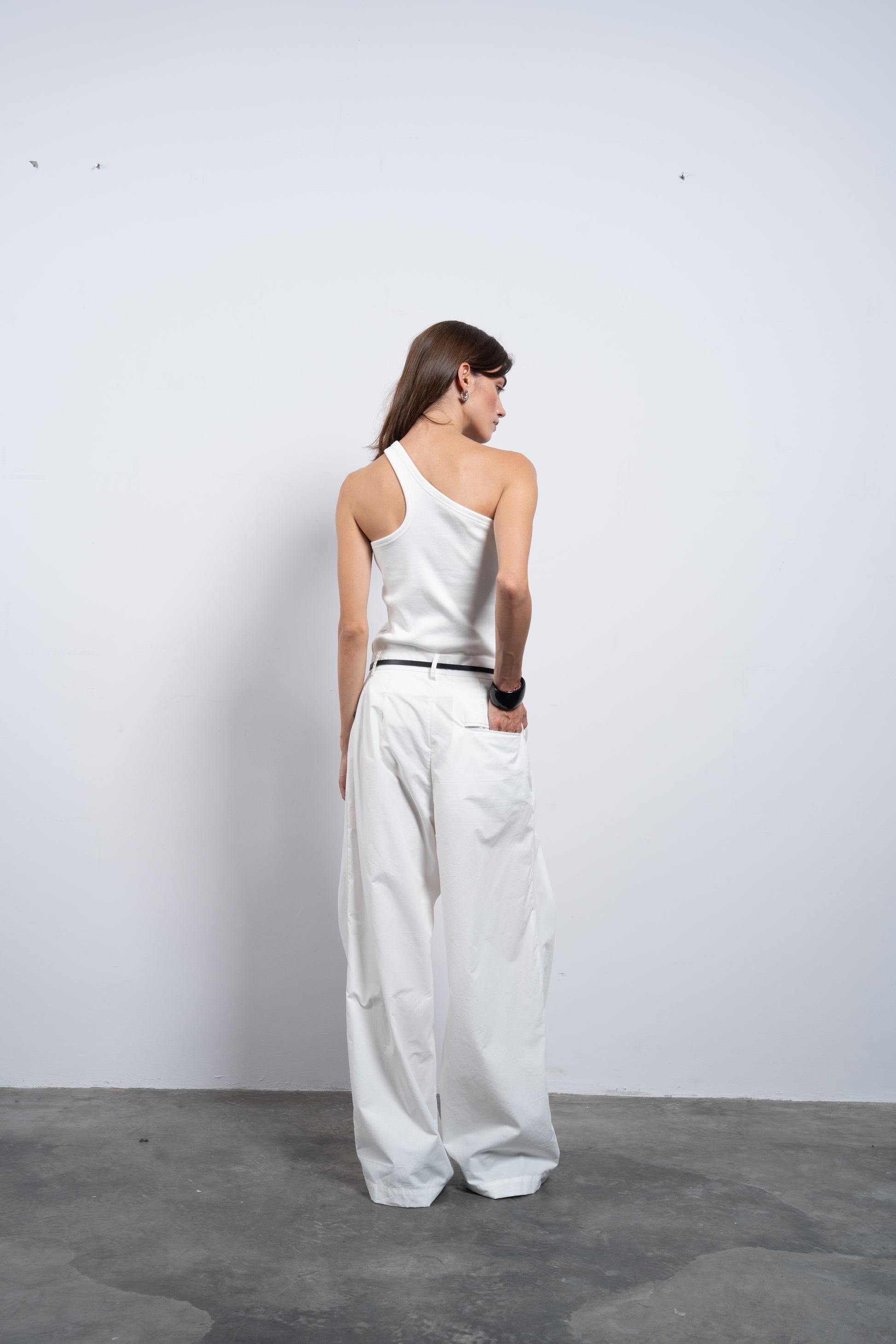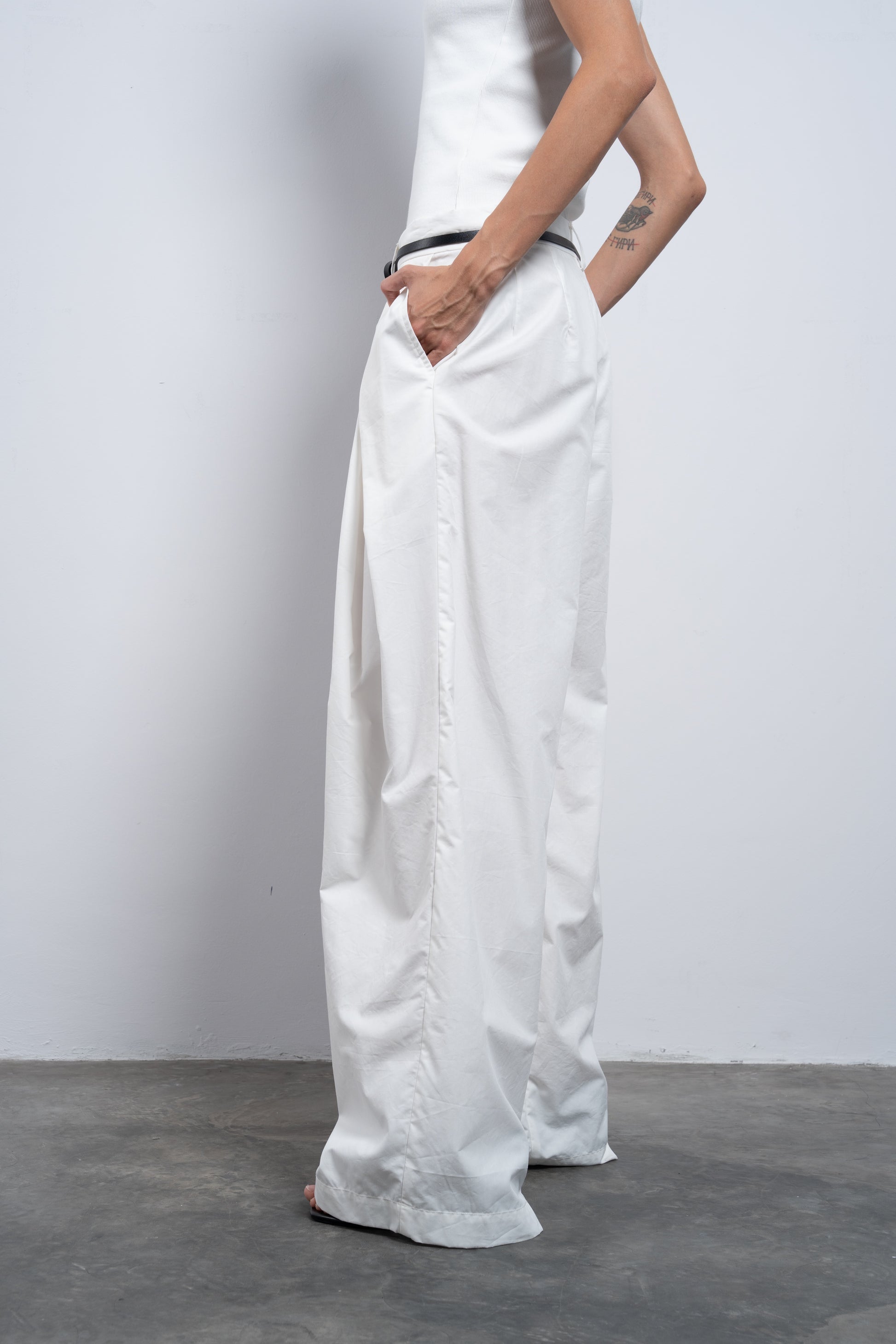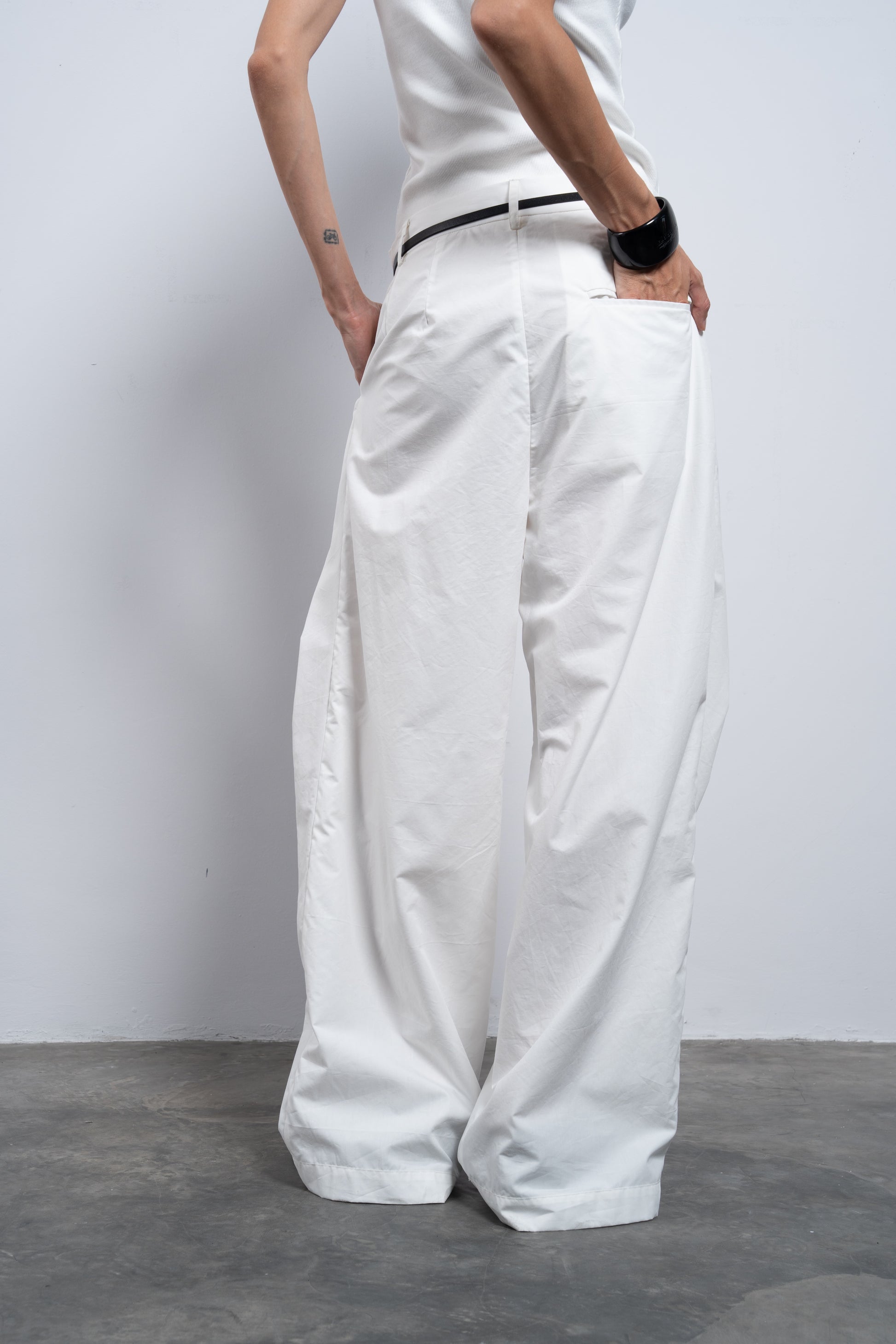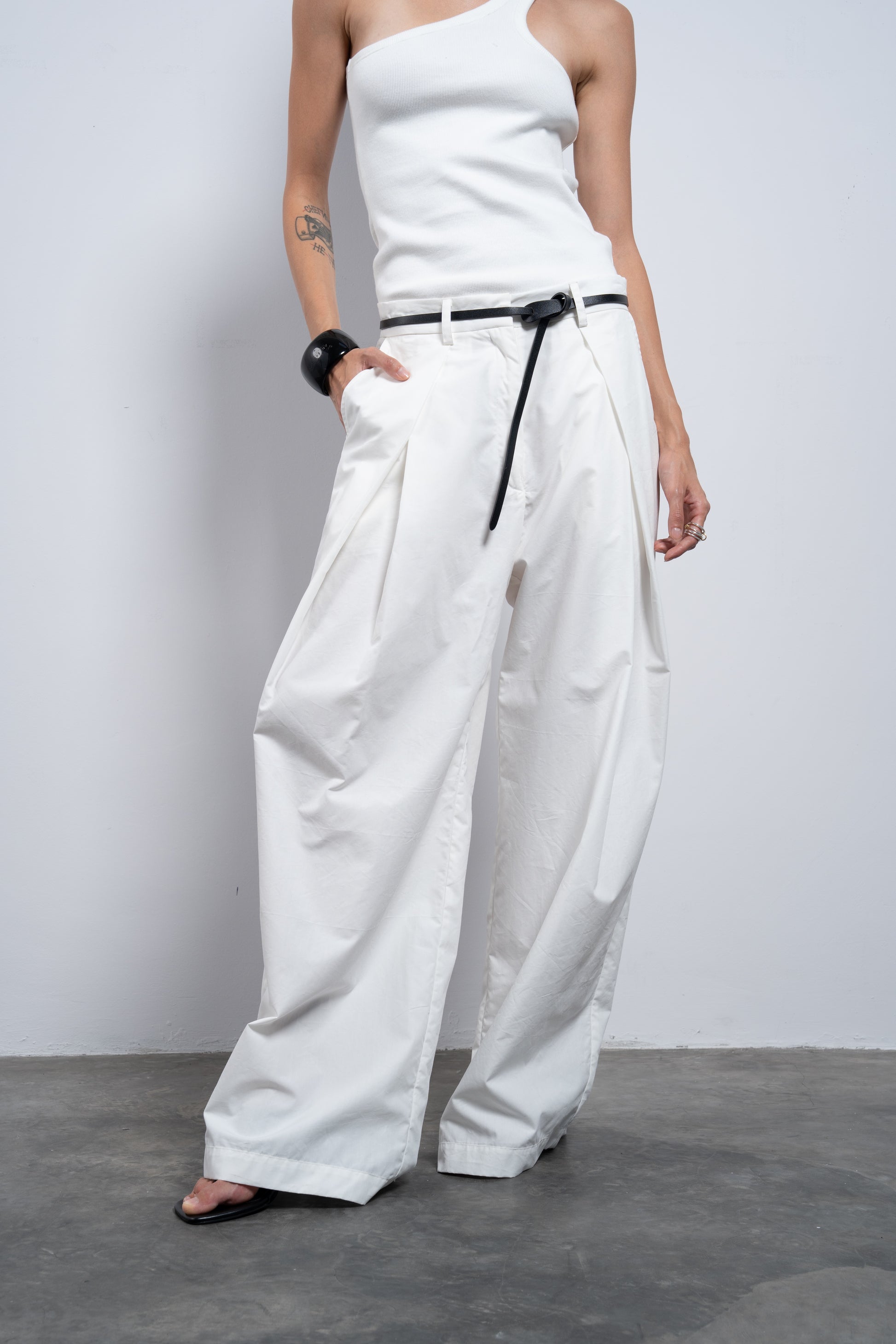 These pants are crafted from airy cotton fabric blended with lyocell, designed to sit low on the waist with fluid wide legs that feature pleats folded toward each other. They strike the perfect balance between polished and relaxed, making them versatile enough to be paired with either a crisp shirt or a simple tank top.