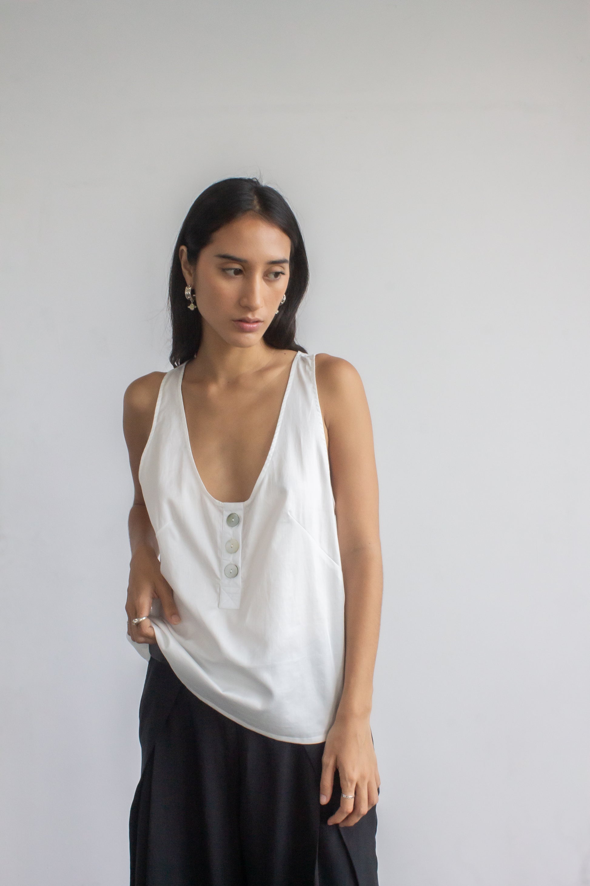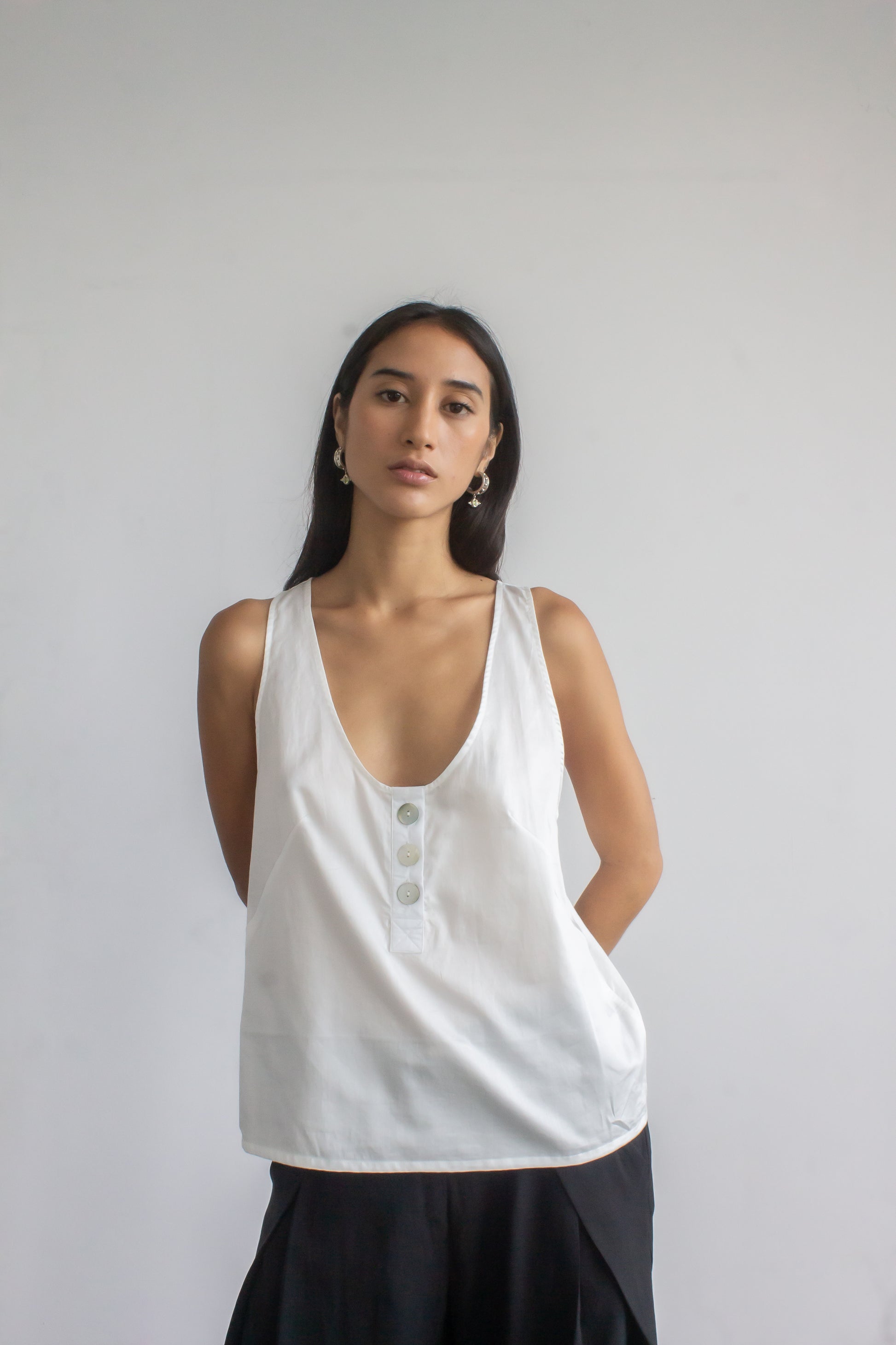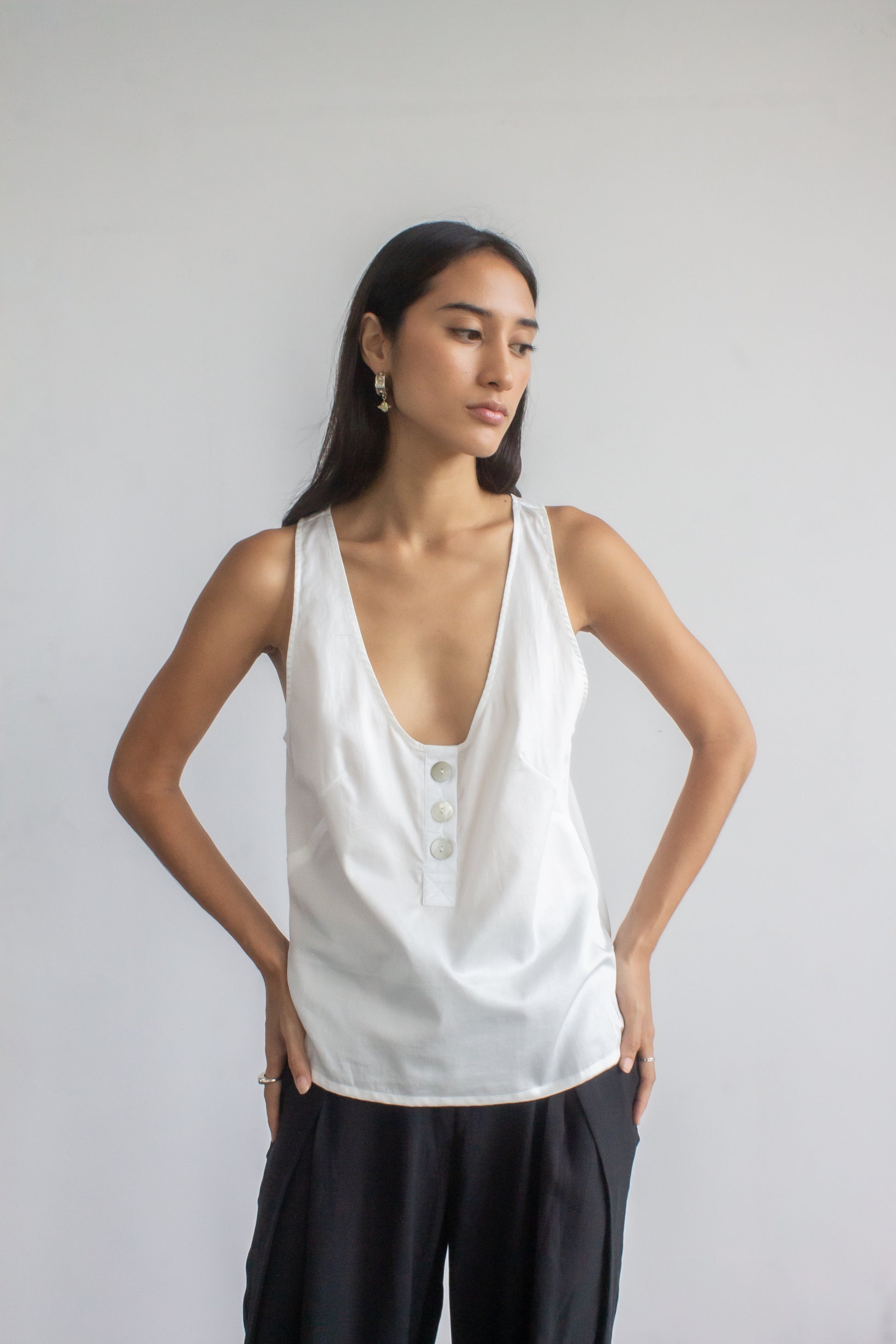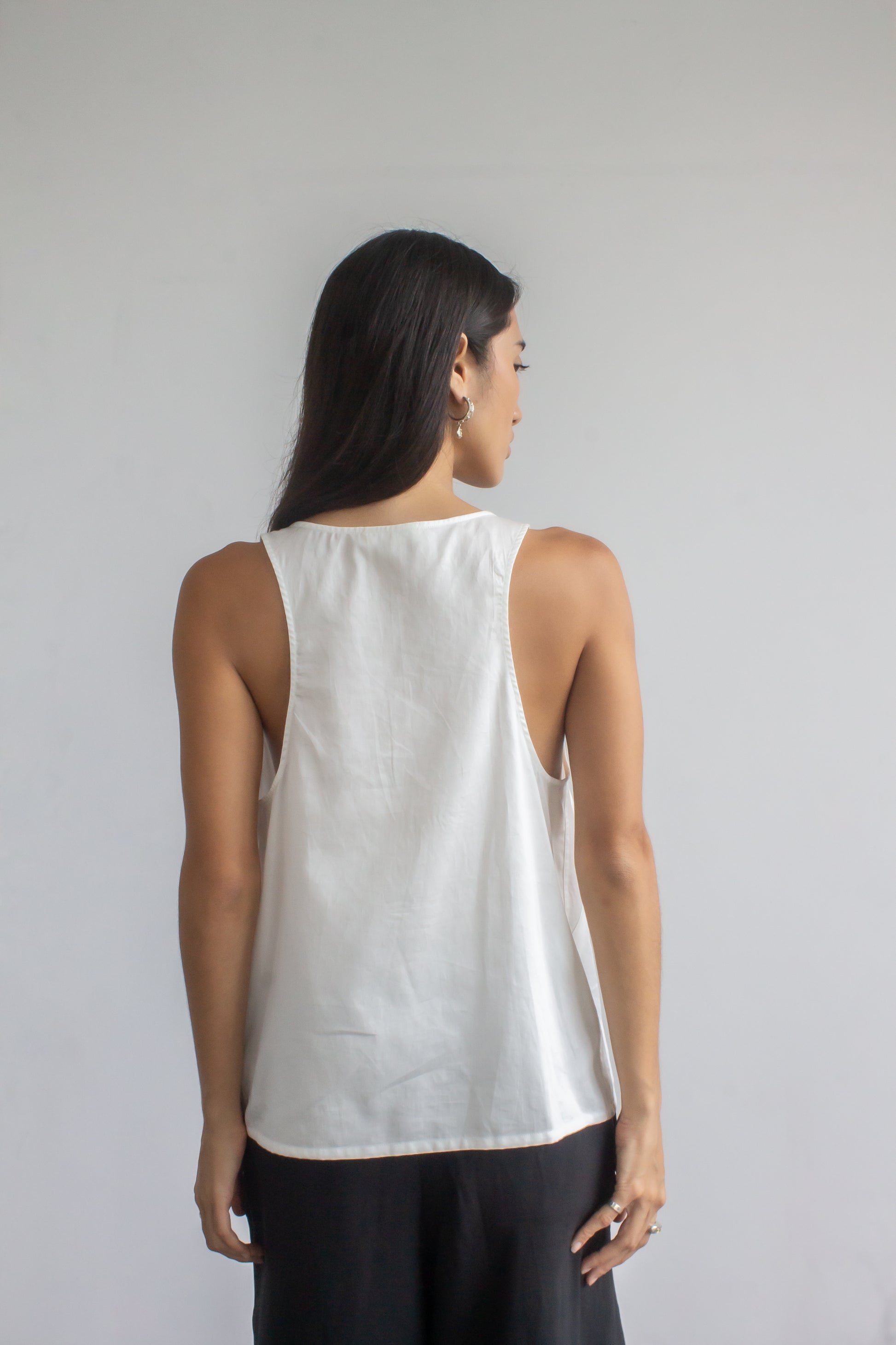 Cut from crisp cotton sateen, this top drapes in a relaxed silhouette defined by front darts. A scoop neckline with a tidy button placket and low-cut armholes keeps it airy, while the racerback adds a clean, sporty line. Wear it solo with our satin palazzo pants for a night out, or pair it with classic pleated trousers for an office-ready summer look.