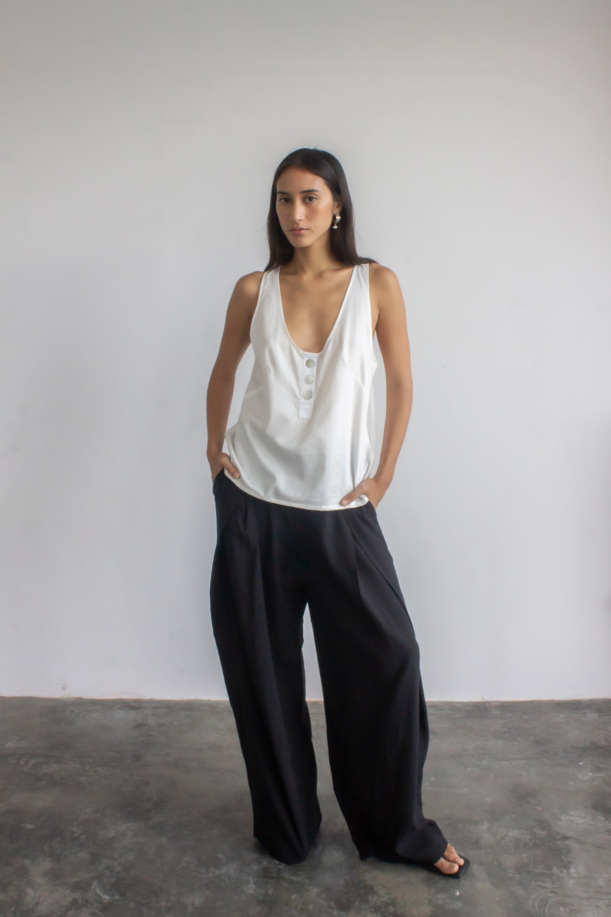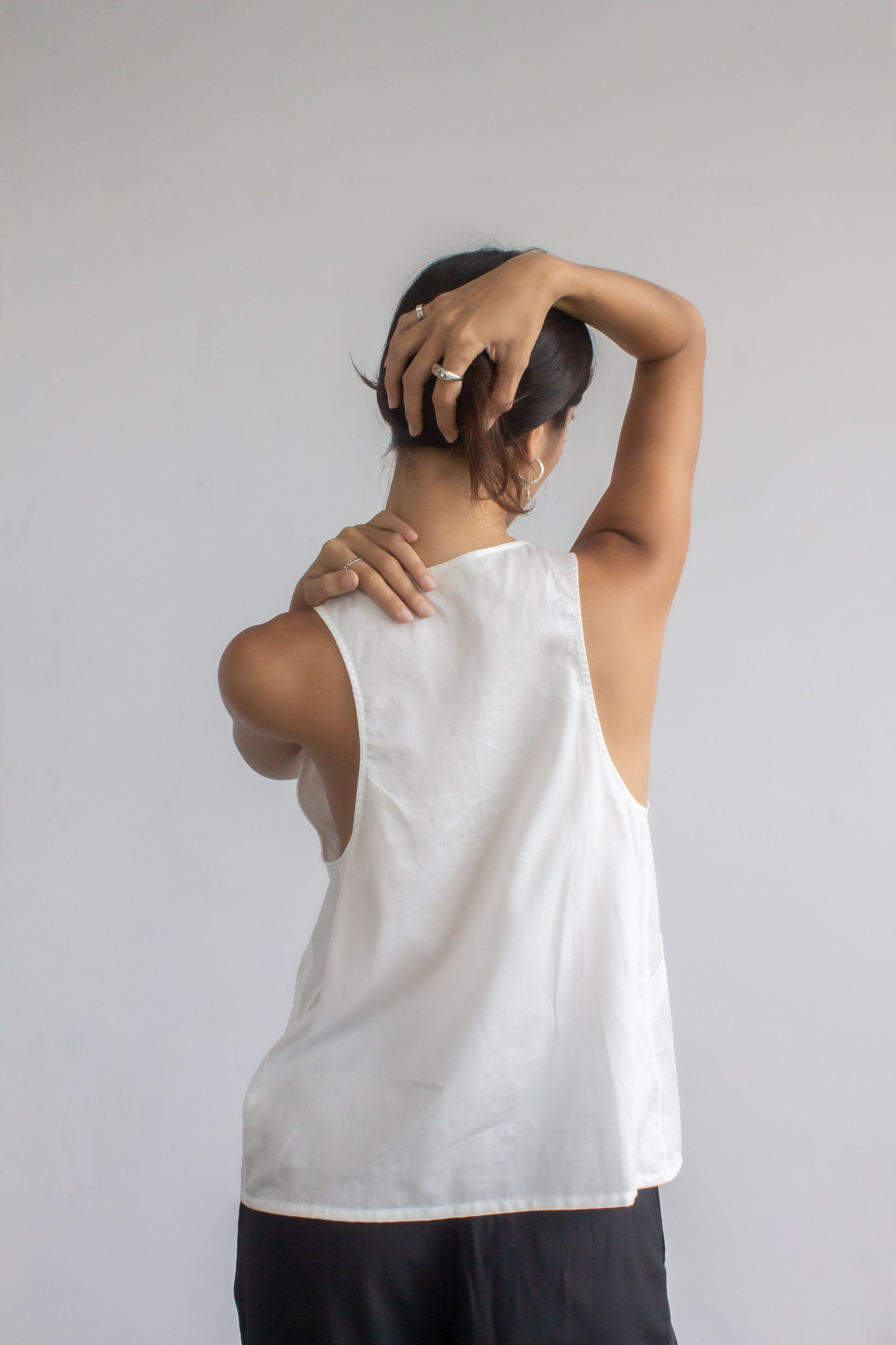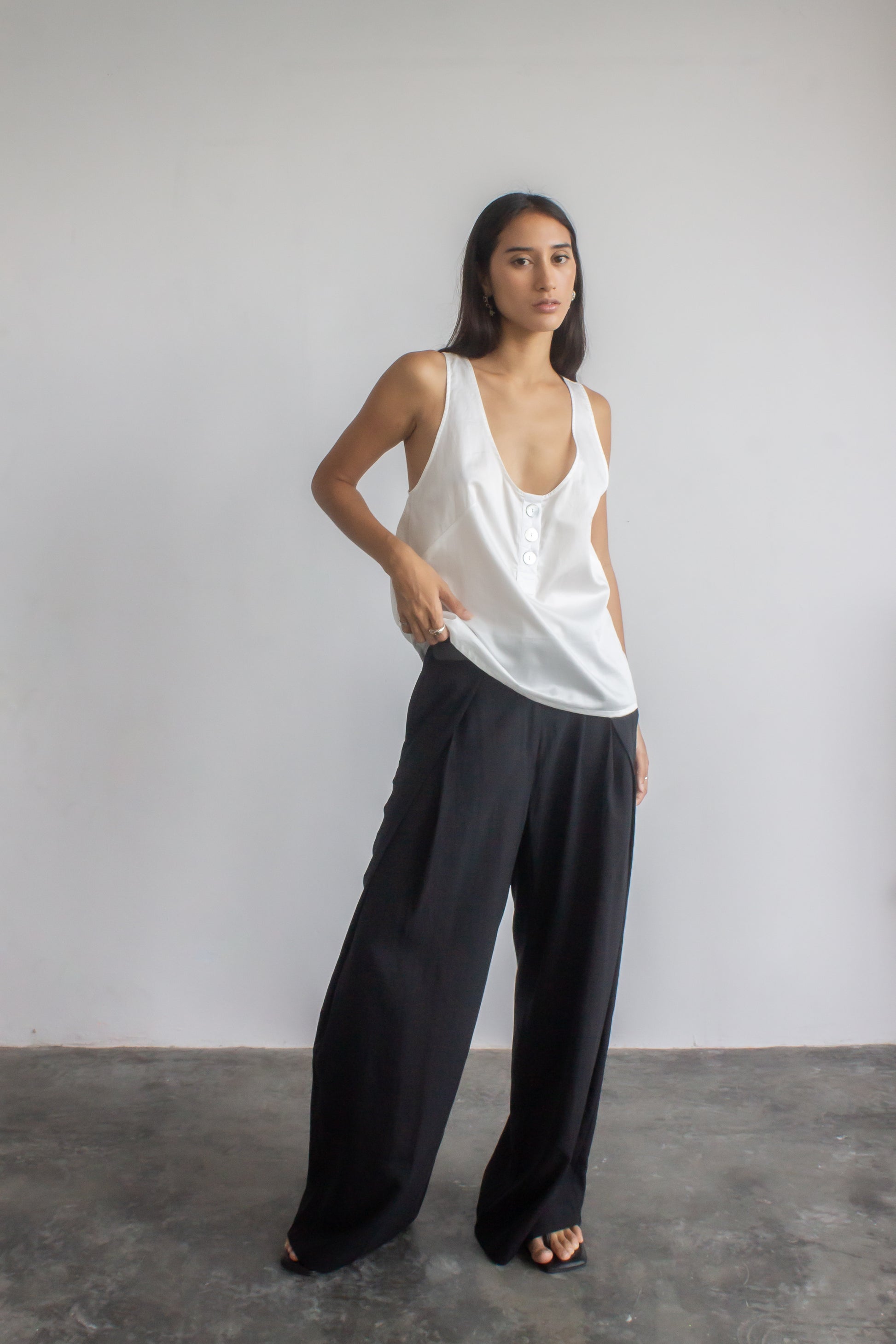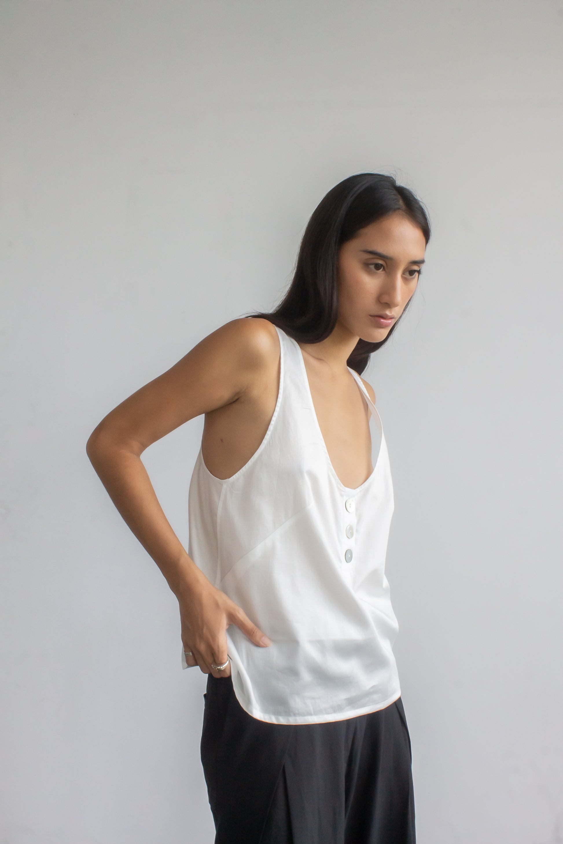 Cut from crisp cotton sateen, this top drapes in a relaxed silhouette defined by front darts. A scoop neckline with a tidy button placket and low-cut armholes keeps it airy, while the racerback adds a clean, sporty line. Wear it solo with our satin palazzo pants for a night out, or pair it with classic pleated trousers for an office-ready summer look.
