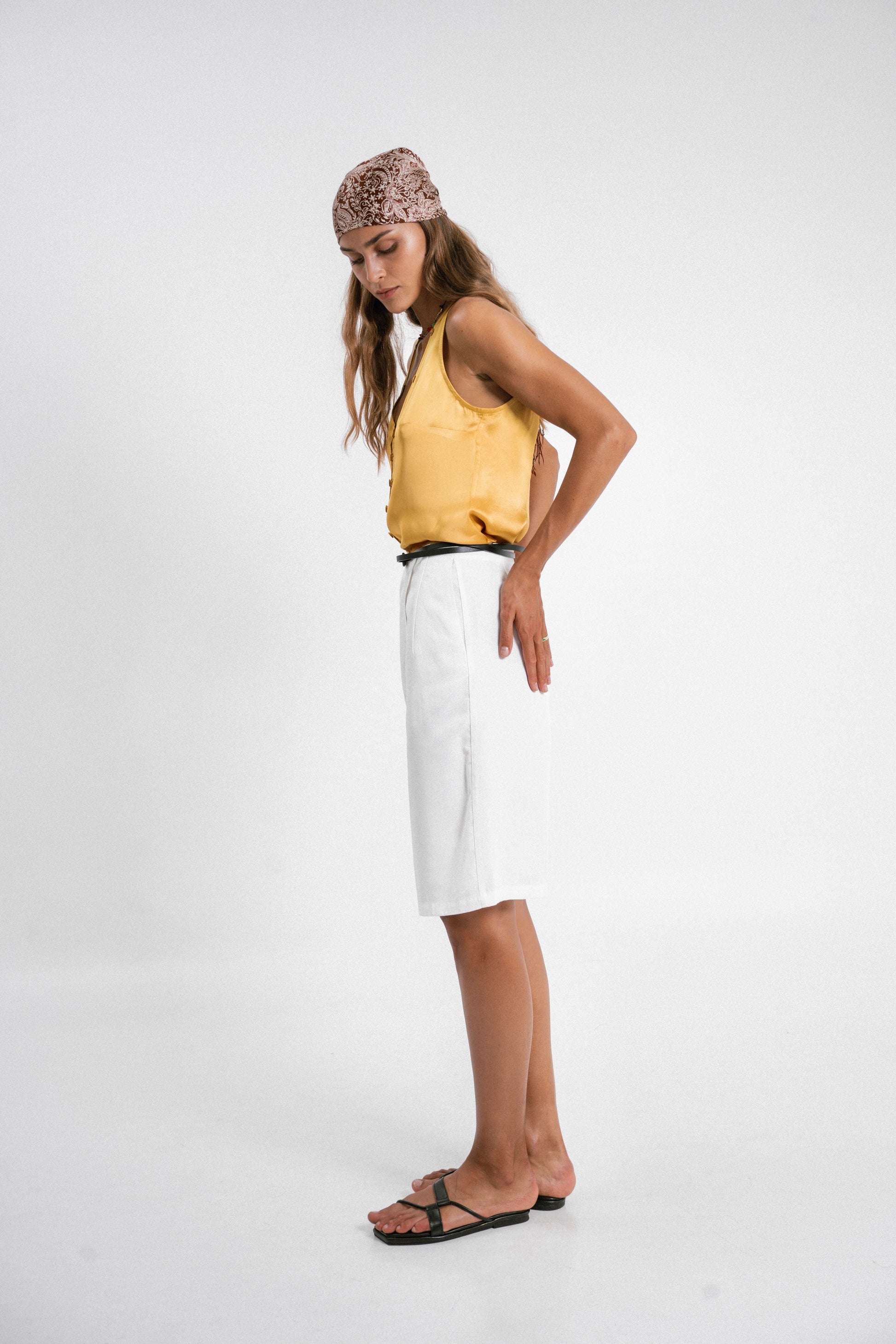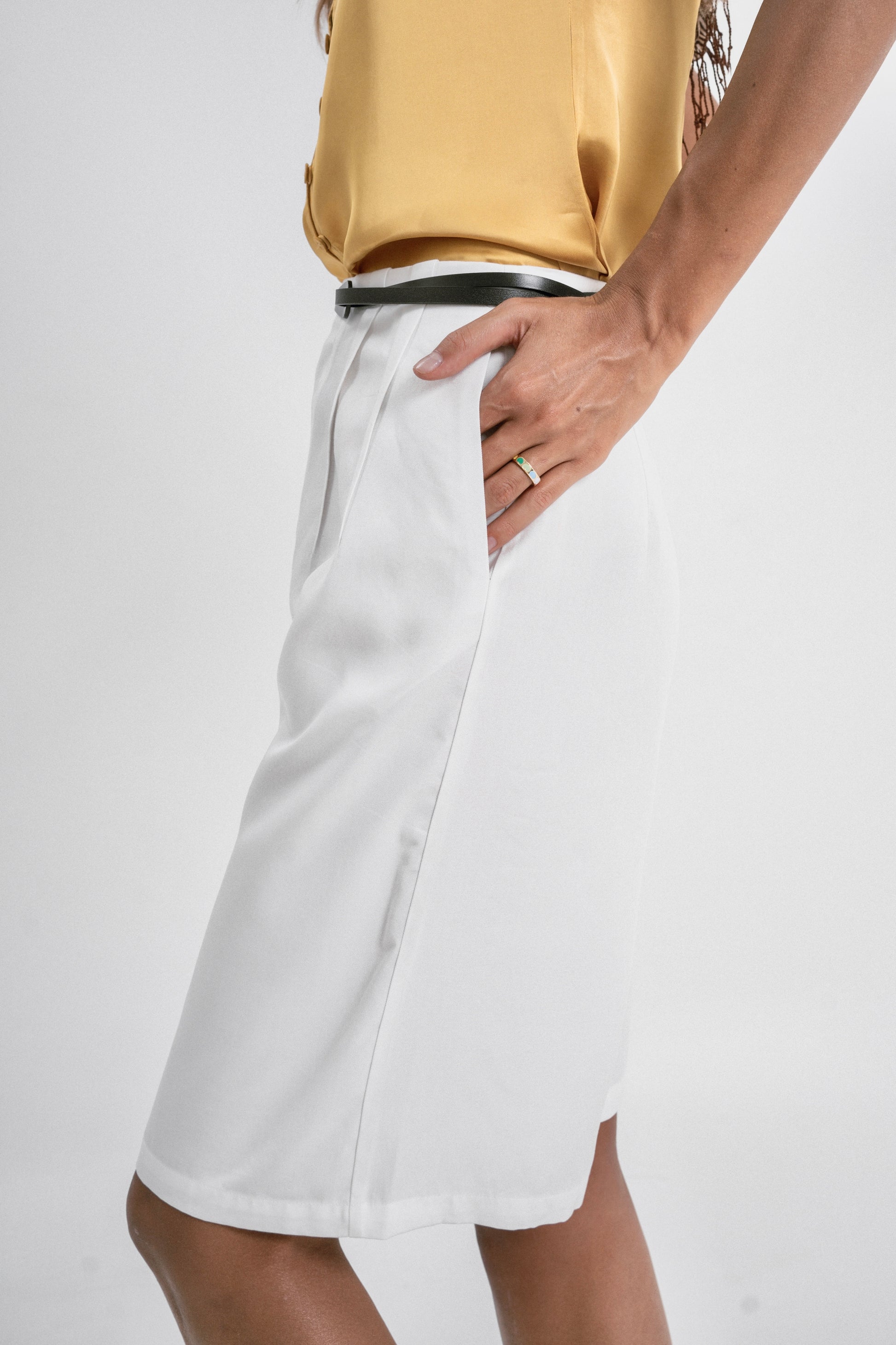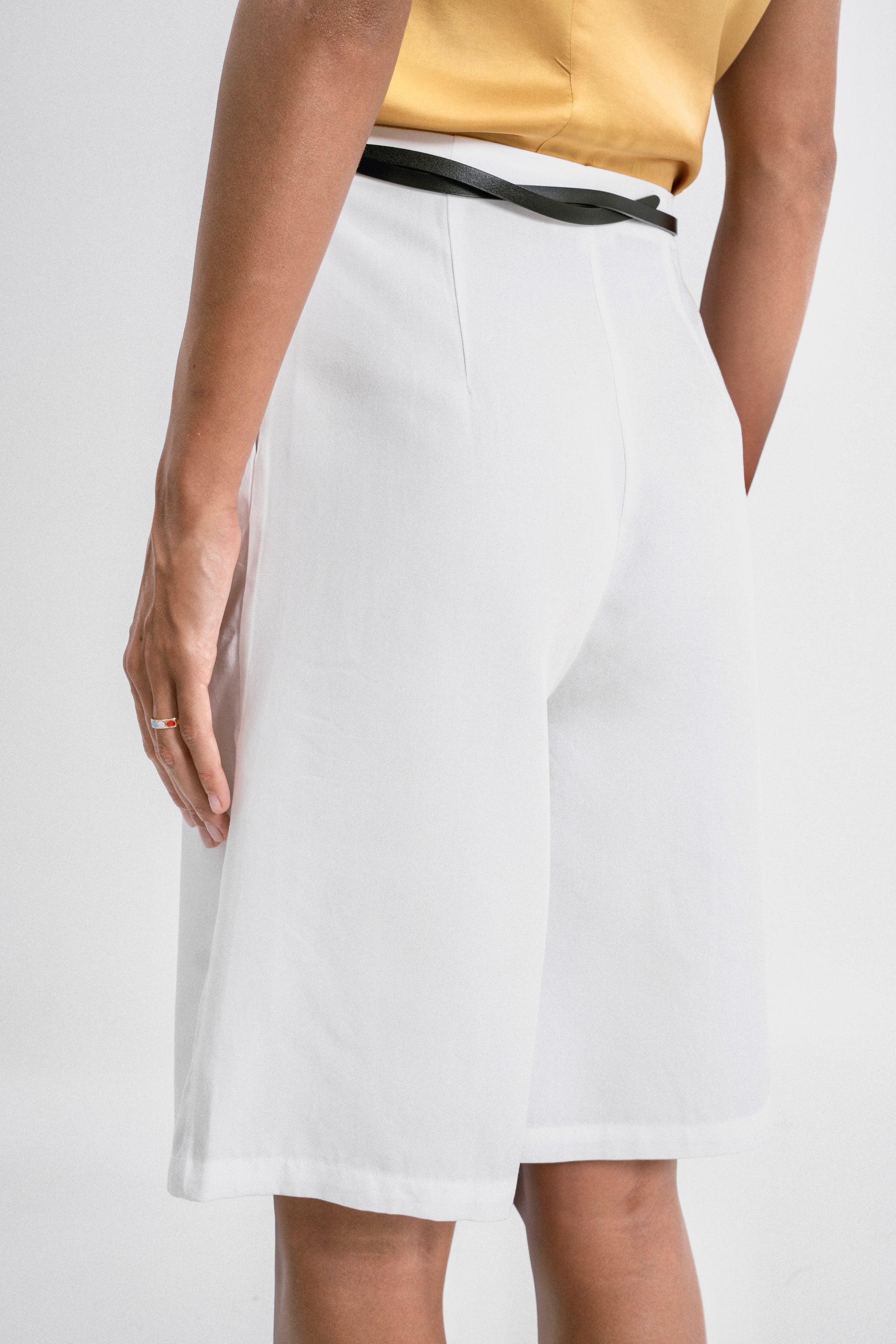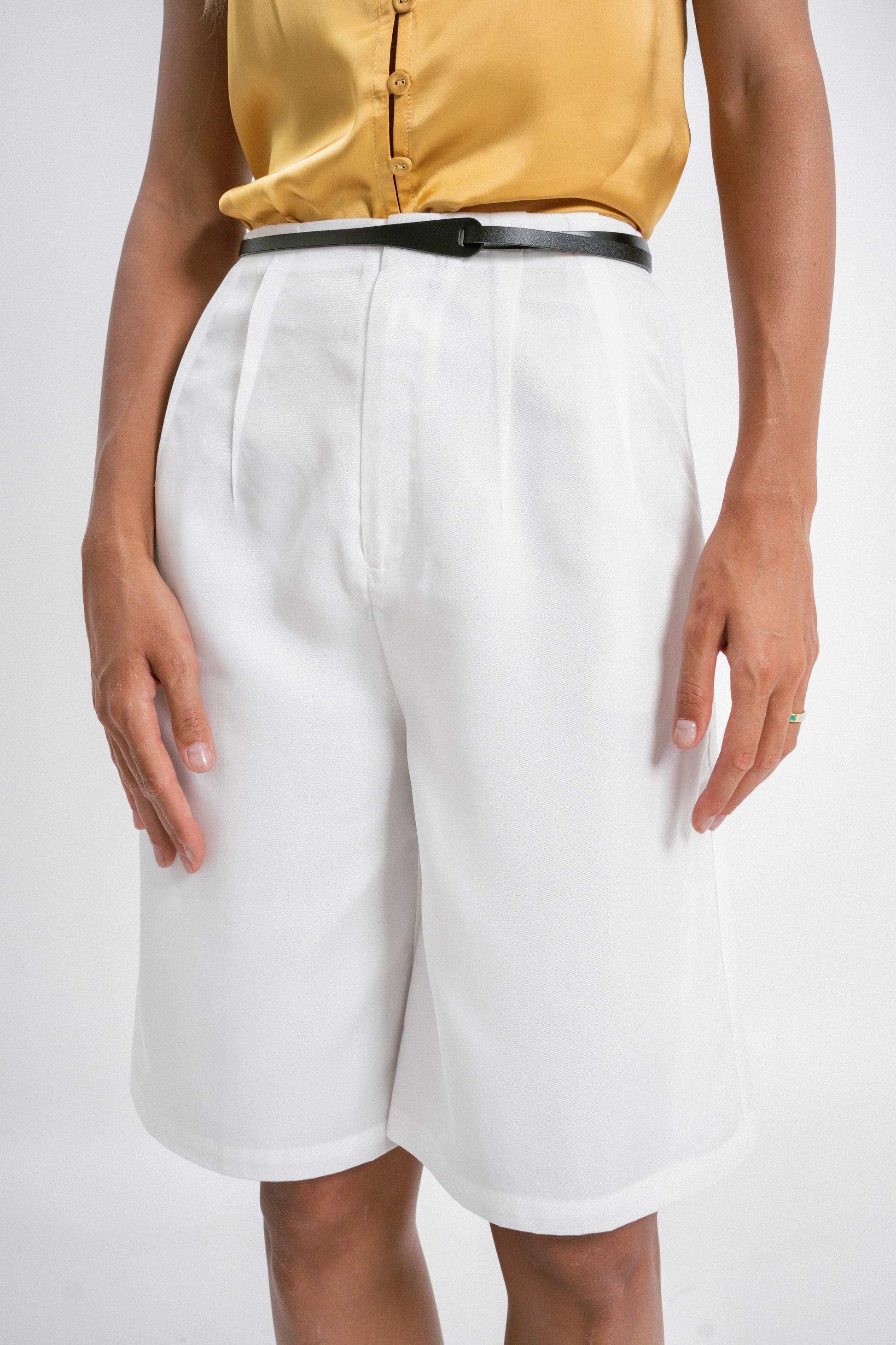 Designed with two stylish outward-facing darts, these knee-length shorts offer a unique and flattering silhouette. Made from premium Tencel, they provide a luxuriously soft feel against your skin, ensuring comfort throughout the day. Pair them with a satin top for a stylish look, or with a bamboo tank for a casual yet refined style.