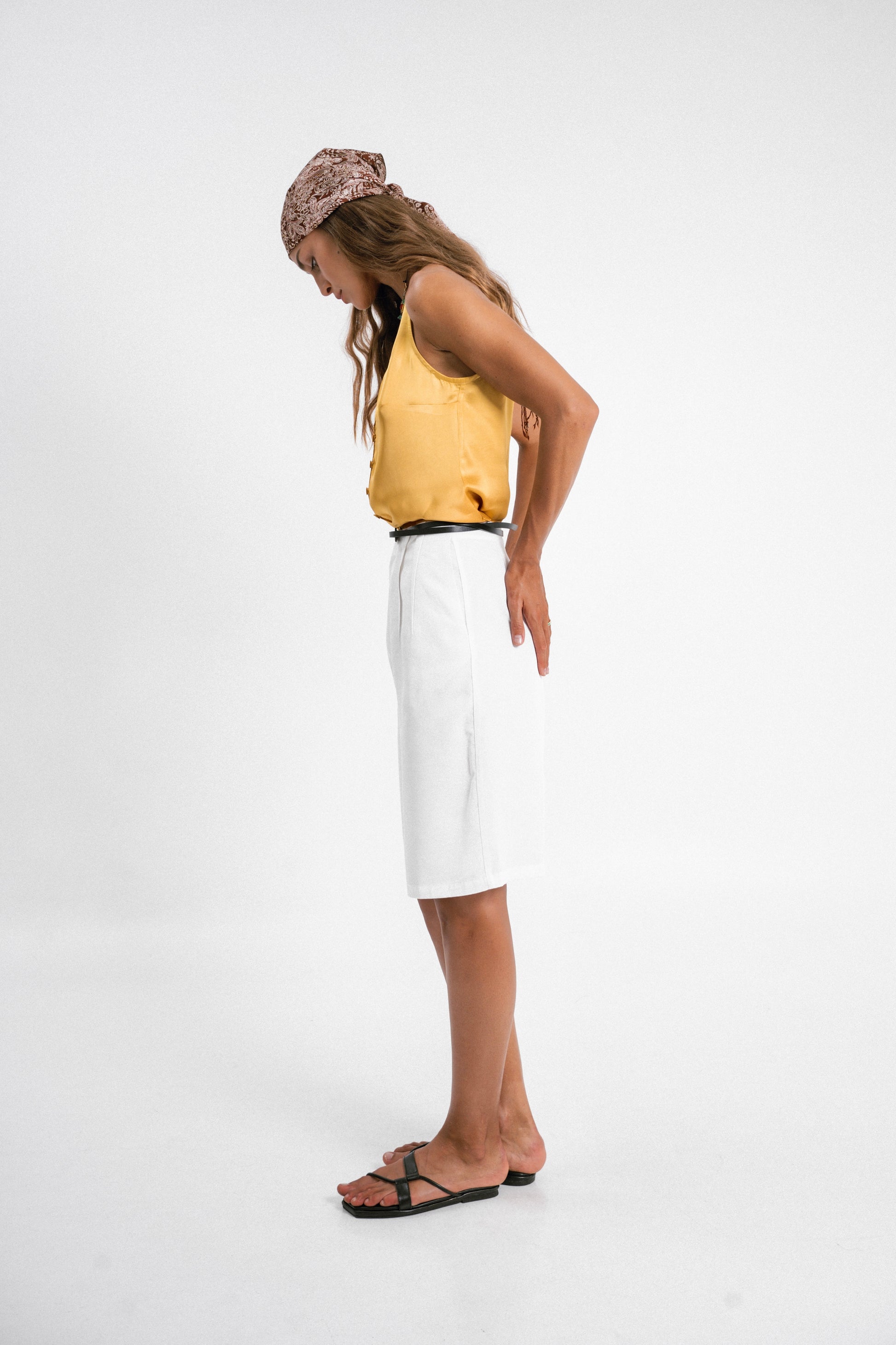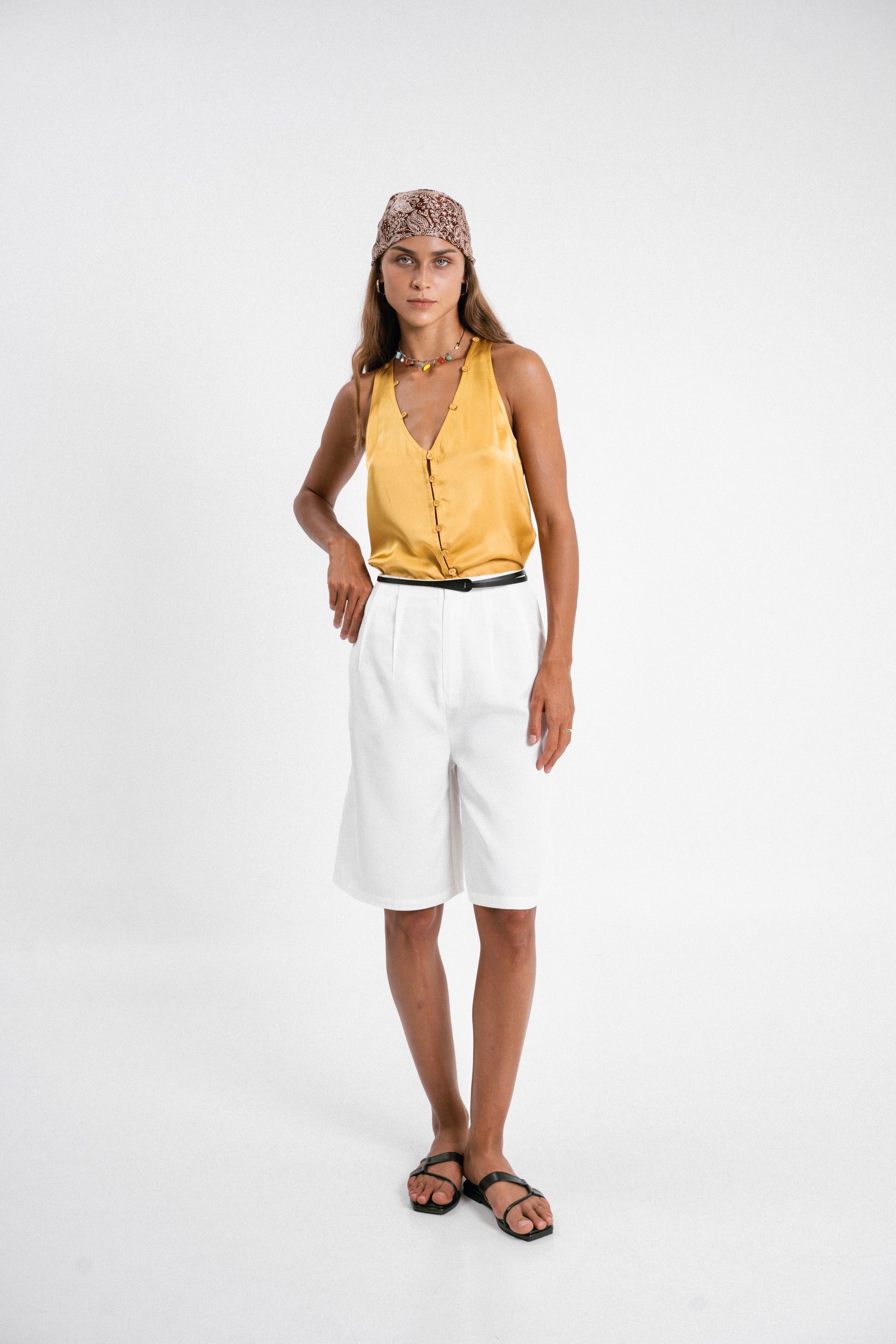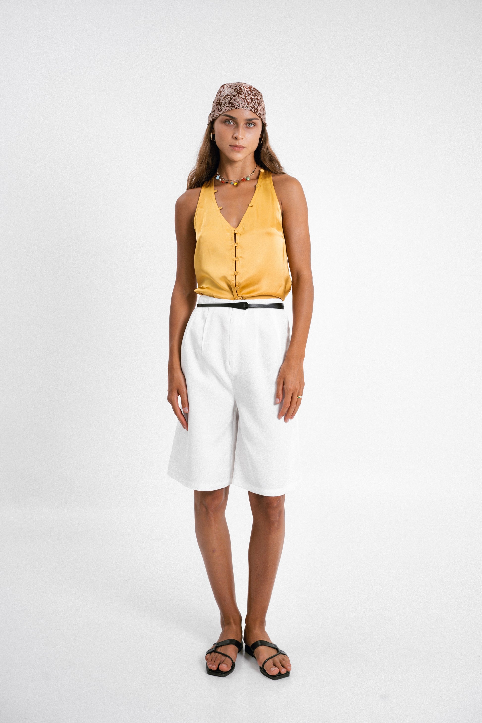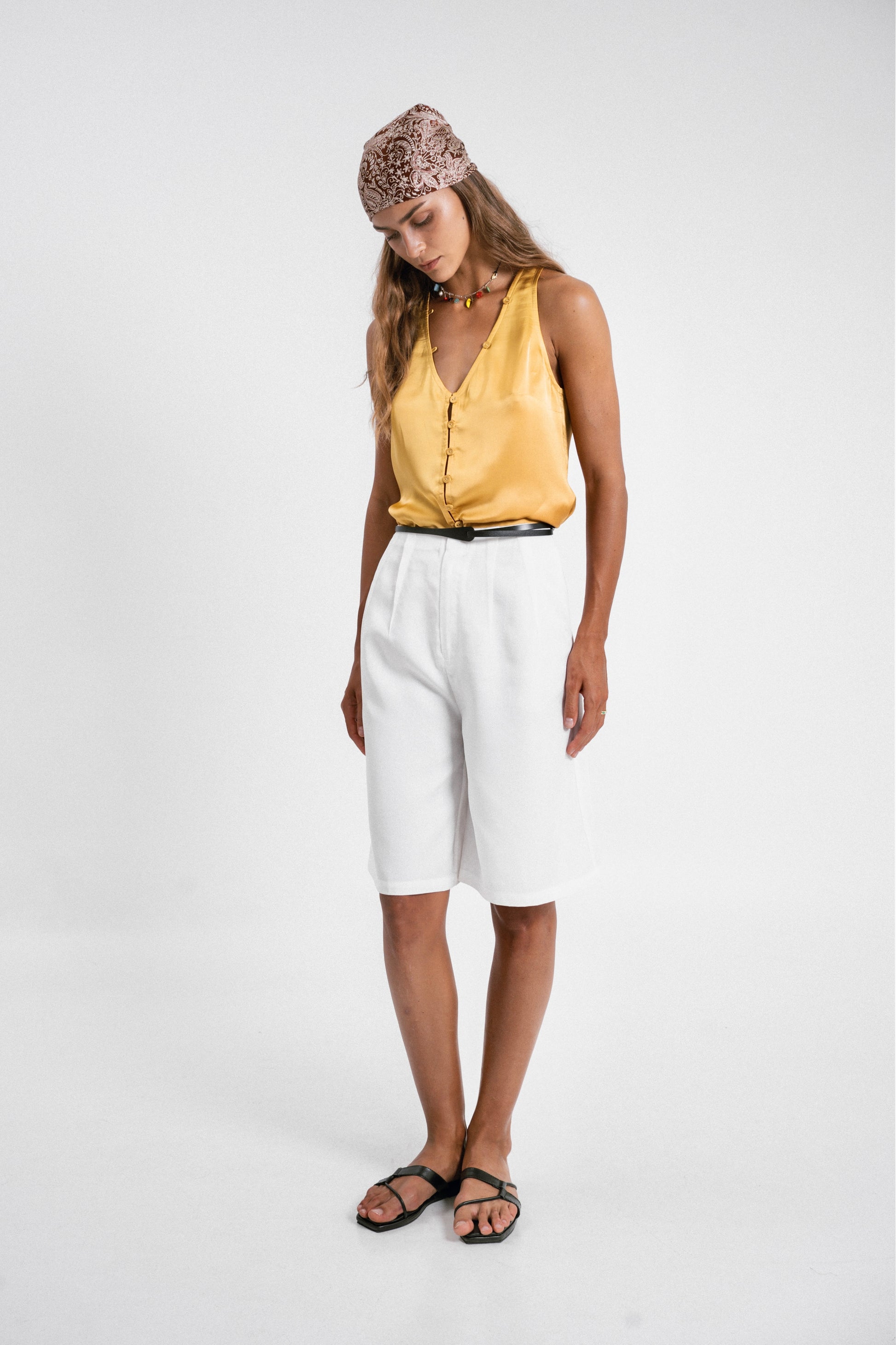 Designed with two stylish outward-facing darts, these knee-length shorts offer a unique and flattering silhouette. Made from premium Tencel, they provide a luxuriously soft feel against your skin, ensuring comfort throughout the day. Pair them with a satin top for a stylish look, or with a bamboo tank for a casual yet refined style.