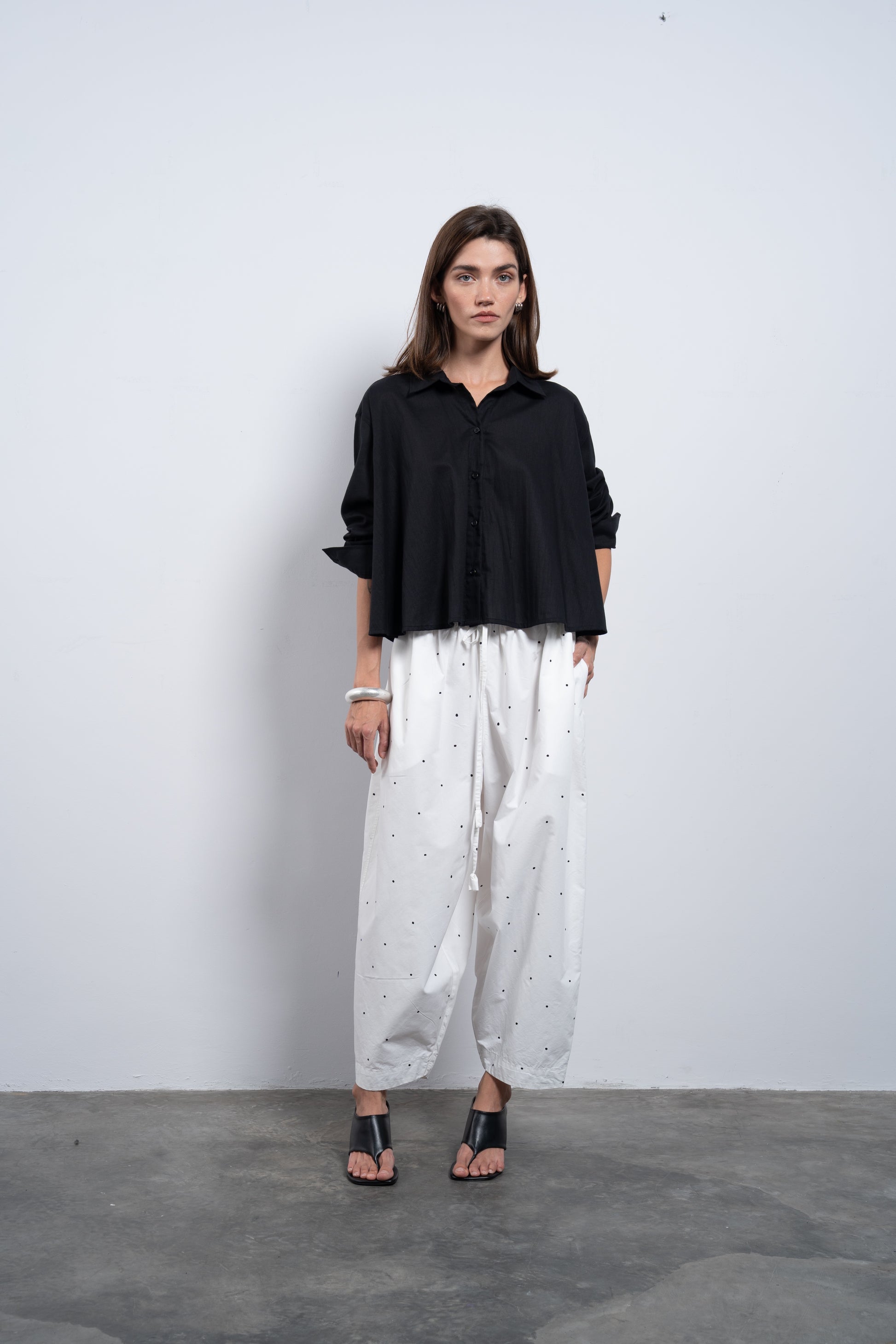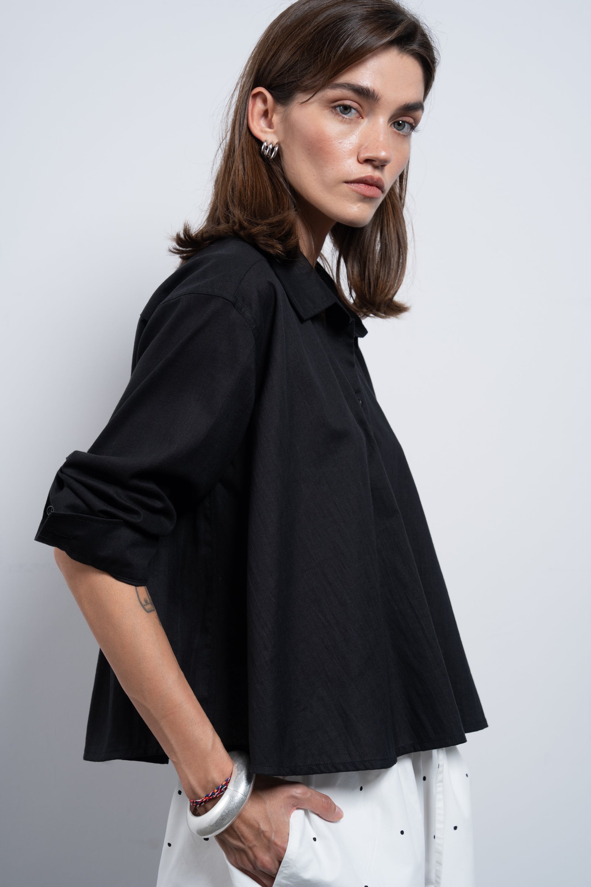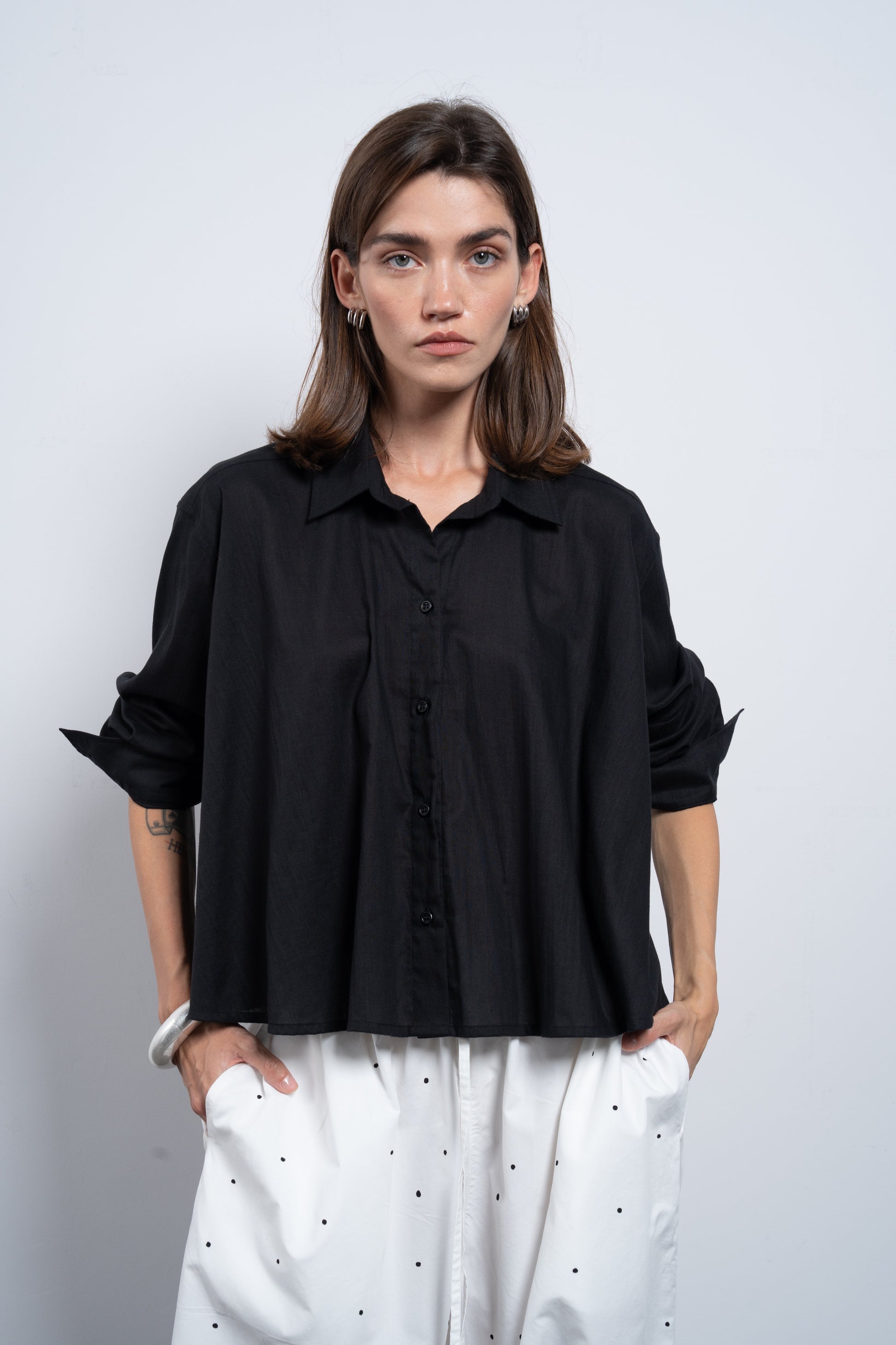 This oversized shirt is inspired by kimono styles. Crafted from textured organic cotton, it is chosen for its breathability and ability to maintain its shape. It features shell buttons along the entire placket and elegant blouson sleeves. The small chamomile embroidery at the bottom enhances the overall handcrafted impression.