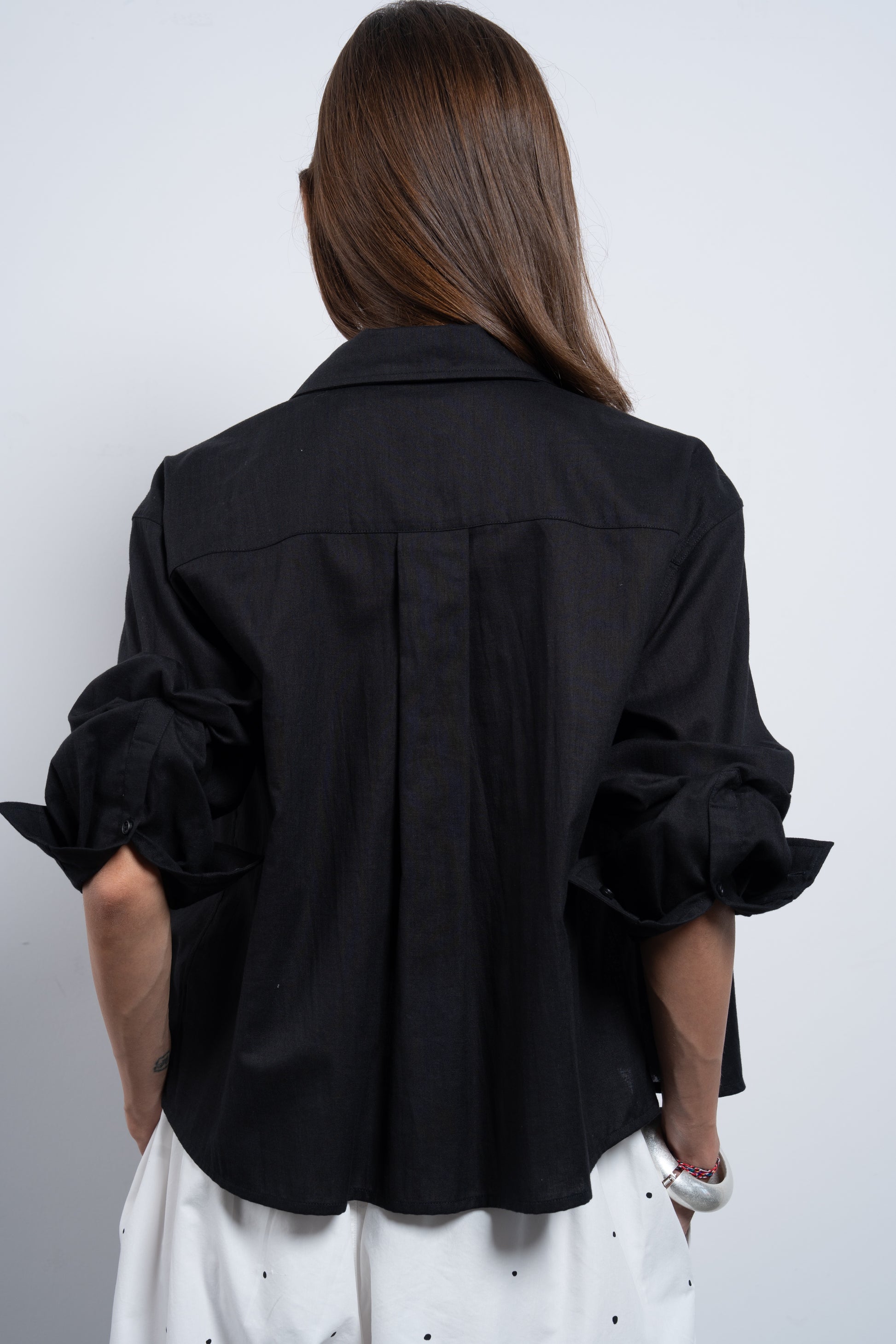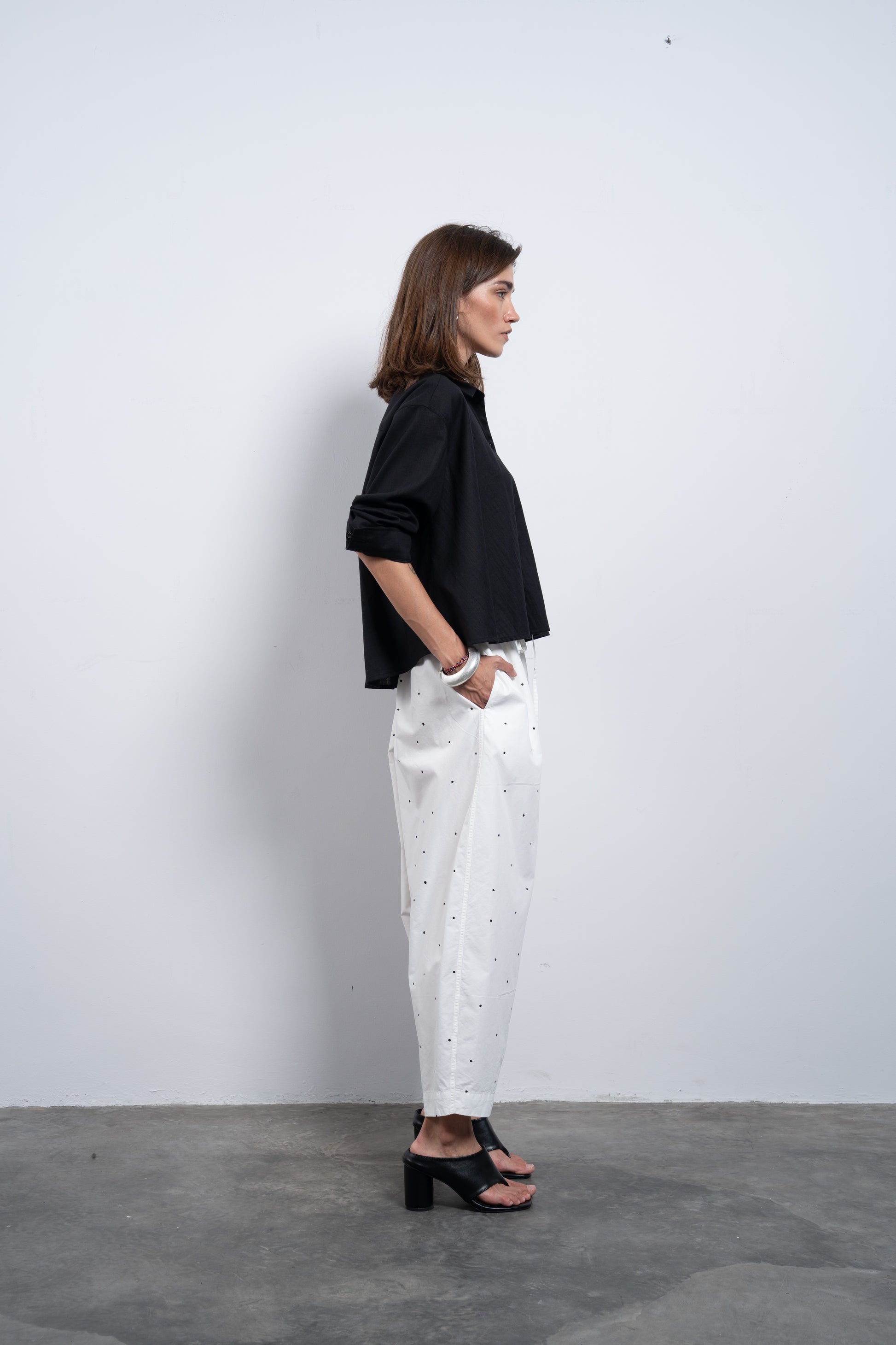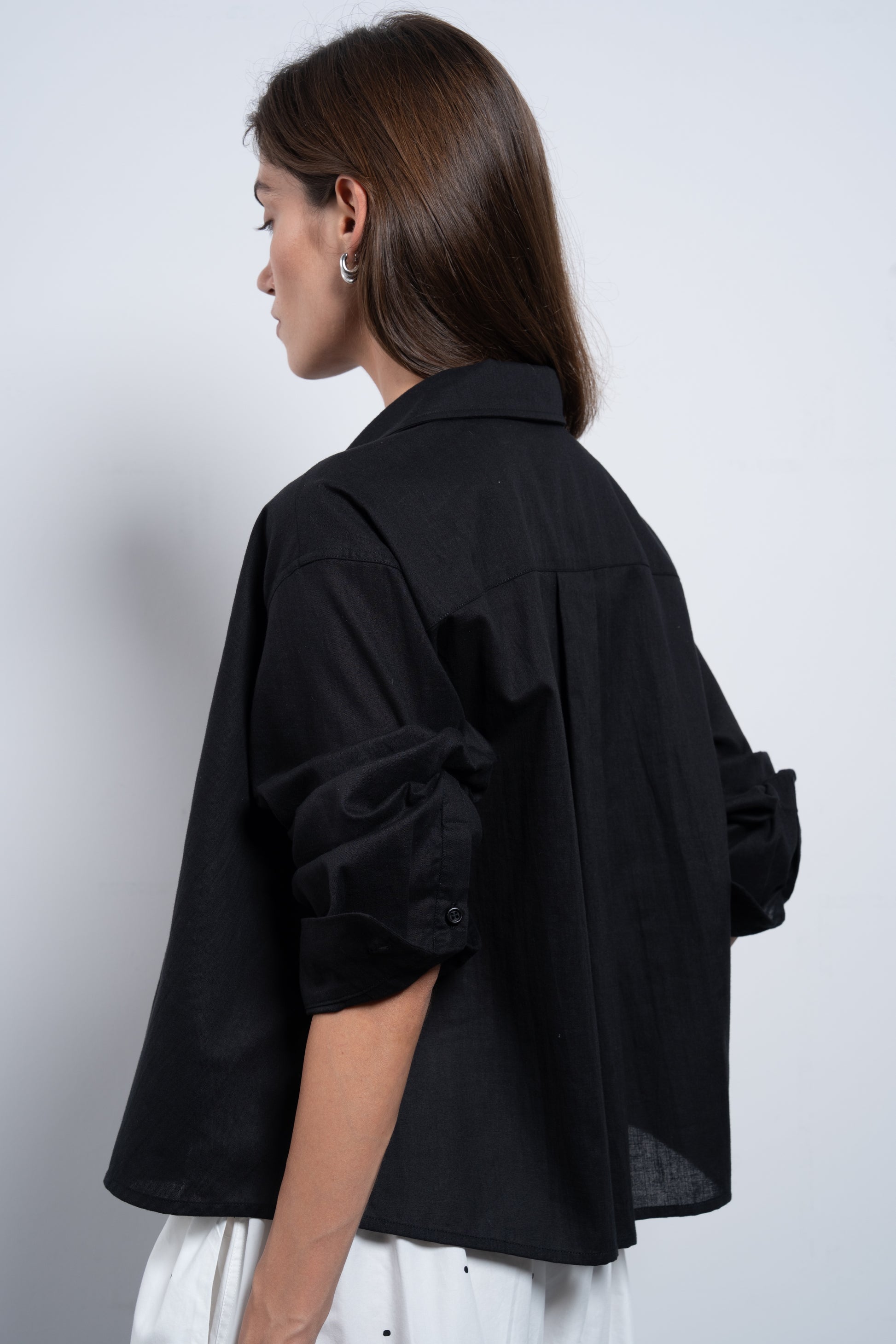 This oversized shirt is inspired by kimono styles. Crafted from textured organic cotton, it is chosen for its breathability and ability to maintain its shape. It features shell buttons along the entire placket and elegant blouson sleeves. The small chamomile embroidery at the bottom enhances the overall handcrafted impression.